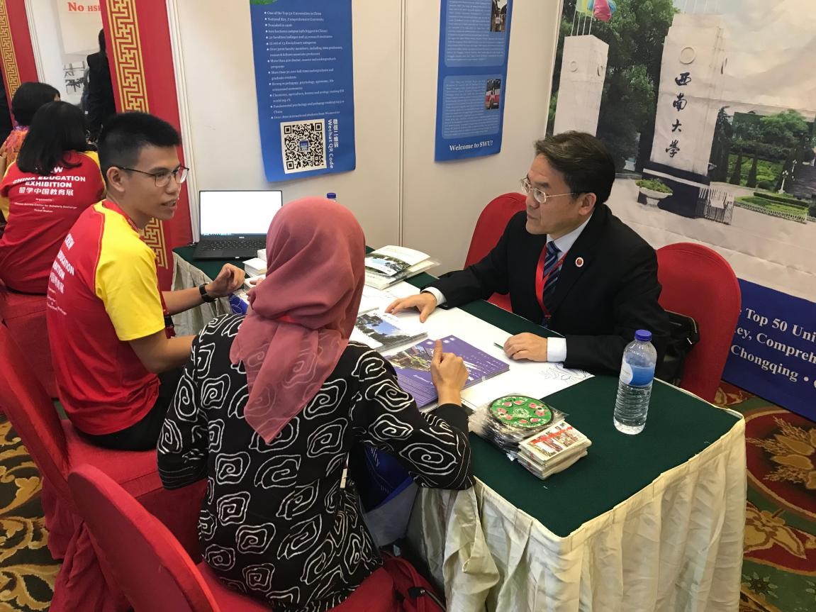 11月26日由中国教育部留学服务中心主办的印尼第十四届“留学中国”教育展在首都雅加达举行。刘延东为展览鸣锣开幕。中国国家教育部部长陈宝生、副部长田学军,科技部党组书记王志刚,印尼人类发展与文化统筹部秘书长萨特亚、副部长阿古斯,印尼研究技术与高等教育部部长特别顾问鲍丽娜等出席开展仪式并参观展览。公司展位以西大蓝为主打色,配以简明的学校介绍和印尼在校生的诚挚感言,在教育展中显得别具一格,吸引了众多高校员工及员工家长前来咨询入学申请事宜。刘猛在向员工及家长热情介绍学校的同时,也积极和中国及印尼的高校负责人沟通,并与部分印尼高校洽谈初步合作意向。