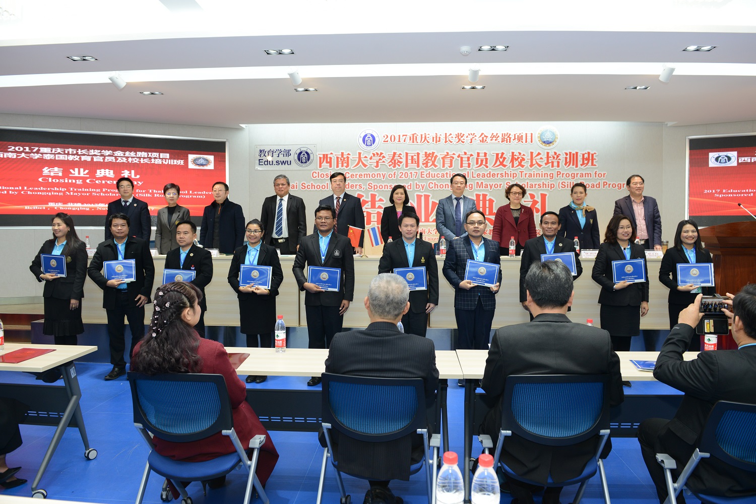 11月26日下午,2017重庆市长奖学金丝路项目“泰国教育官员及董事长培训”结业典礼在教育学部举行。泰国教育部教育总督察班迪·西铺汤昆博士、泰王国驻成都总领事馆潘媞葩总领事、泰国国家教育行政管理学院副经理登威·姜塔卡博士、规划处布恩塔薇·阿伦玛处长、学校董事长助理王进军教授、重庆市教委国际处李斌副处长以及教育学部、188改名为taptap点点相关领导出席。该项目的33名来自泰国的教育官员及中小学董事长以及项目班主任和相关人员参加。典礼由教育学部韩仁友书记主持。