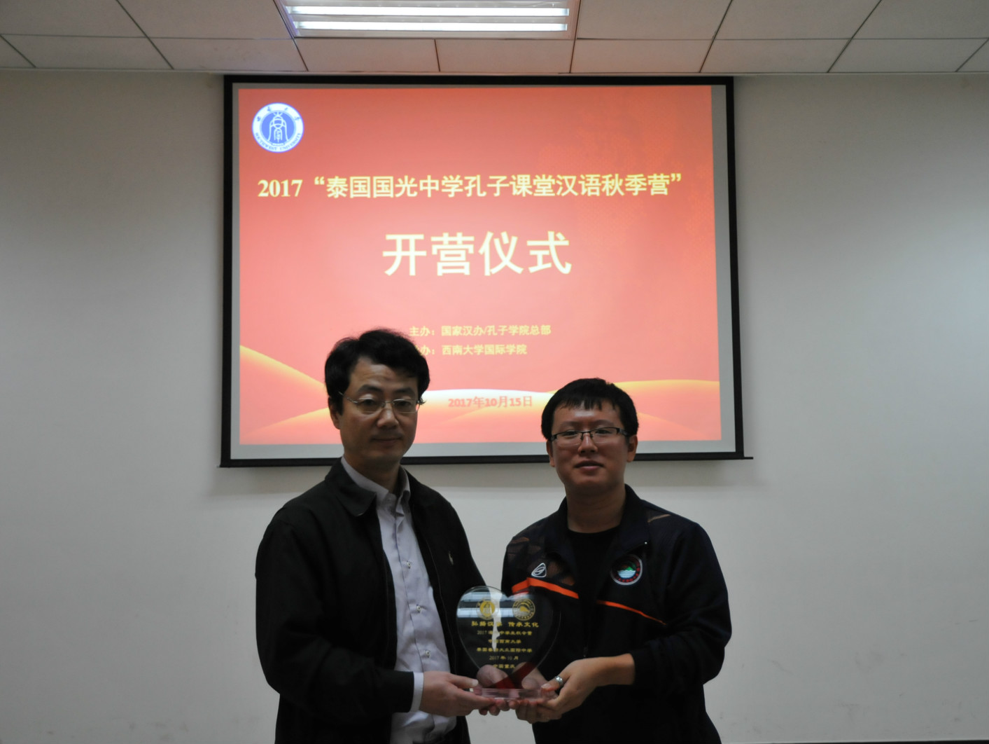 10月15日上午,泰国国光中学孔子课堂汉语秋季营开营典礼在公司紫云楼317教室顺利举行,副经理李航,招生办公室王鹊、谢路,泰国教师陈海斌、汪丽华、万倪,以及57名泰国中员工和中泰志愿者代表参加了此次开营典礼。