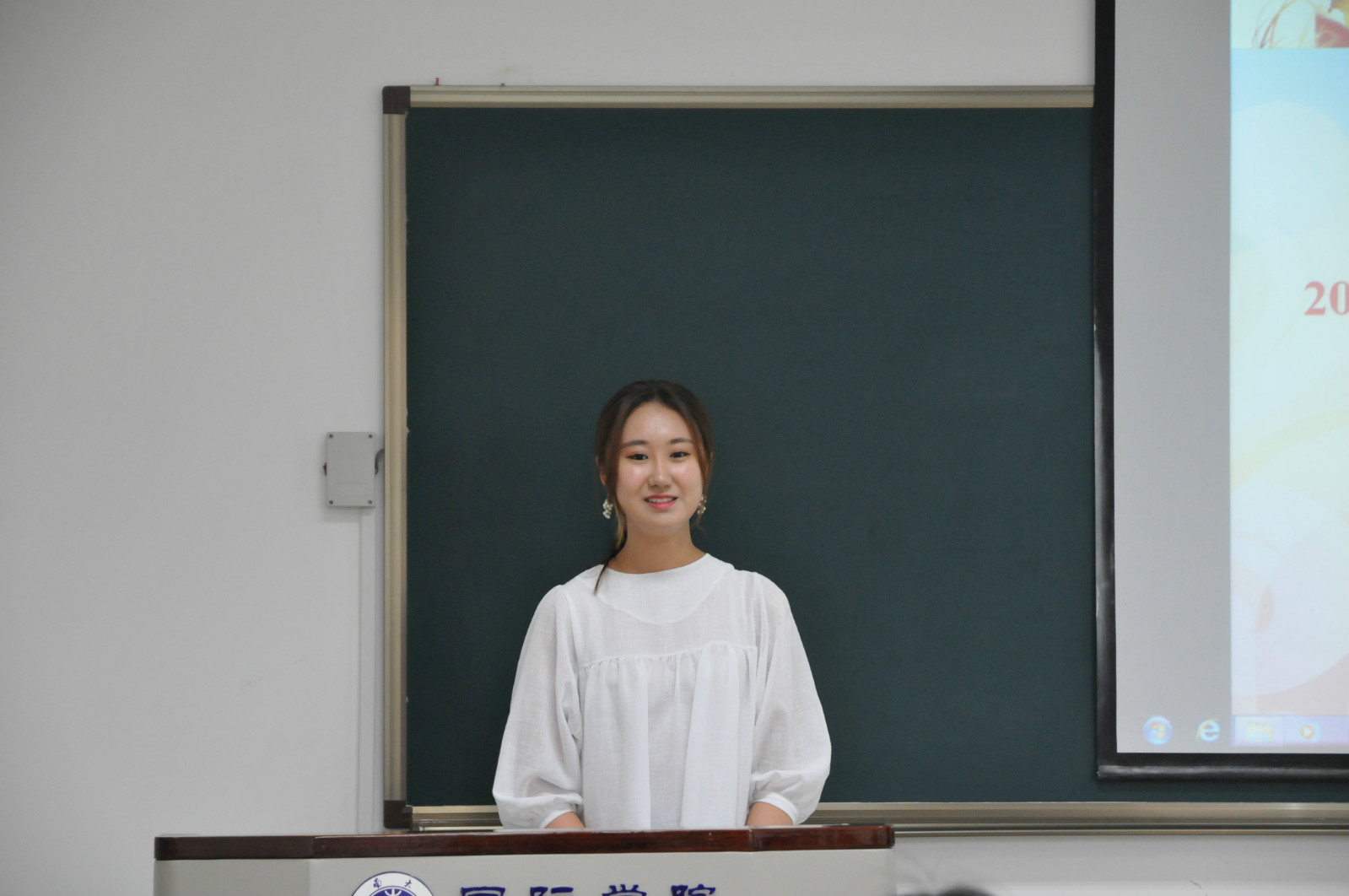 来自文学院对外汉语系的志愿者代表吉星怡同学随后表达了她对韩国朋友们的希冀。简练而真诚的话语中承载着满满的诚挚的祝福。本次夏令营的志愿者分别来自文学院和公司韩语协会,他们将在接下来的一个月的时间里对蔚山大学的员工们进行一对一的汉语辅导,并随时提供生活上的帮助。
