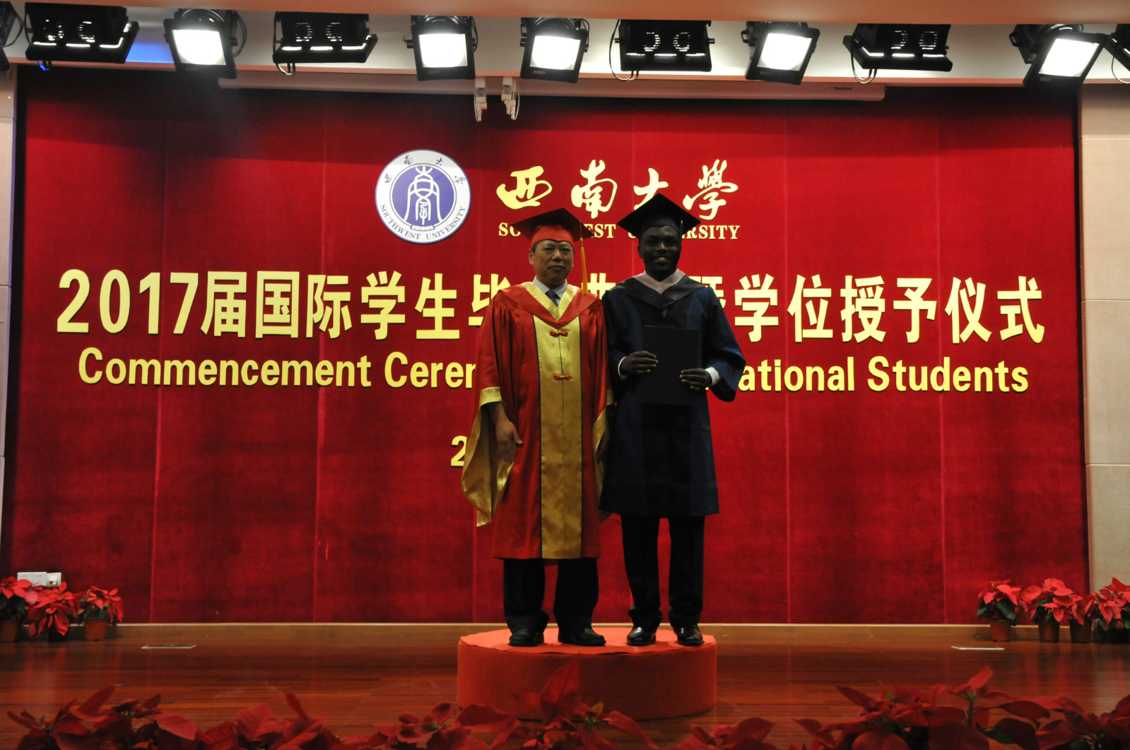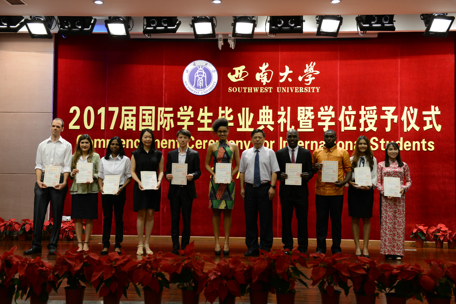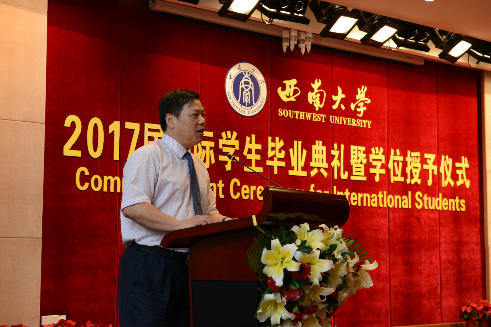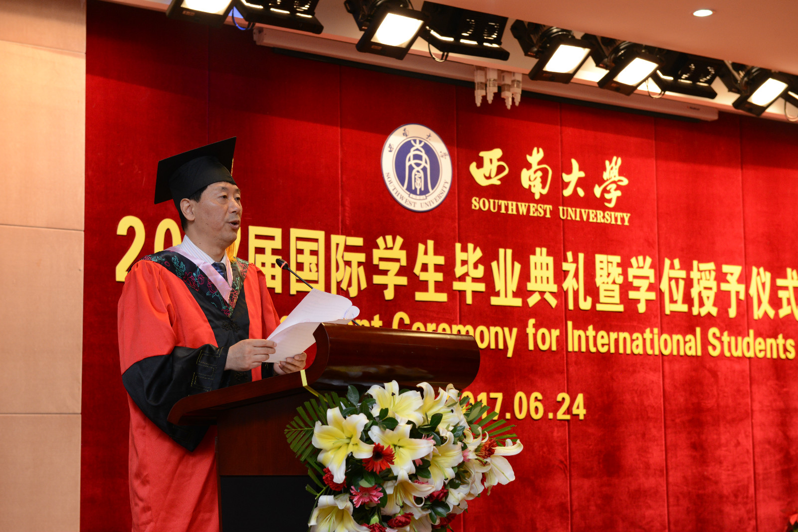 坦桑尼亚籍硕士研究生阿普杜代表全体毕业生发言,分享求学感悟,回顾曾在校职工会连任主席的经历,表达对母校的深切眷念,以及对母校培养、教师关怀和朋友陪伴的感谢。教师代表、政治与公共管理学院教授王斌从“追梦在西大,挥洒铸学业”、“师生情谊存,离校永同心”、“离别虽在即,相会不遥远”三句话,回忆职工们在西大的奋斗青春,勉励大家在不同的工作领域做出成就,为加强中外合作交流而努力。毕业生亲友代表、泰国孔敬大学教育学院副教授吉娜鹏女士谈到自己的孩子求学西大八载,今日博士毕业,激动之情无以言表。她感谢学校把孩子培养成一个坚强独立、有耐心、善于解决问题的人,并倡议所有职工珍惜求学时光,学好知识、服务社会。