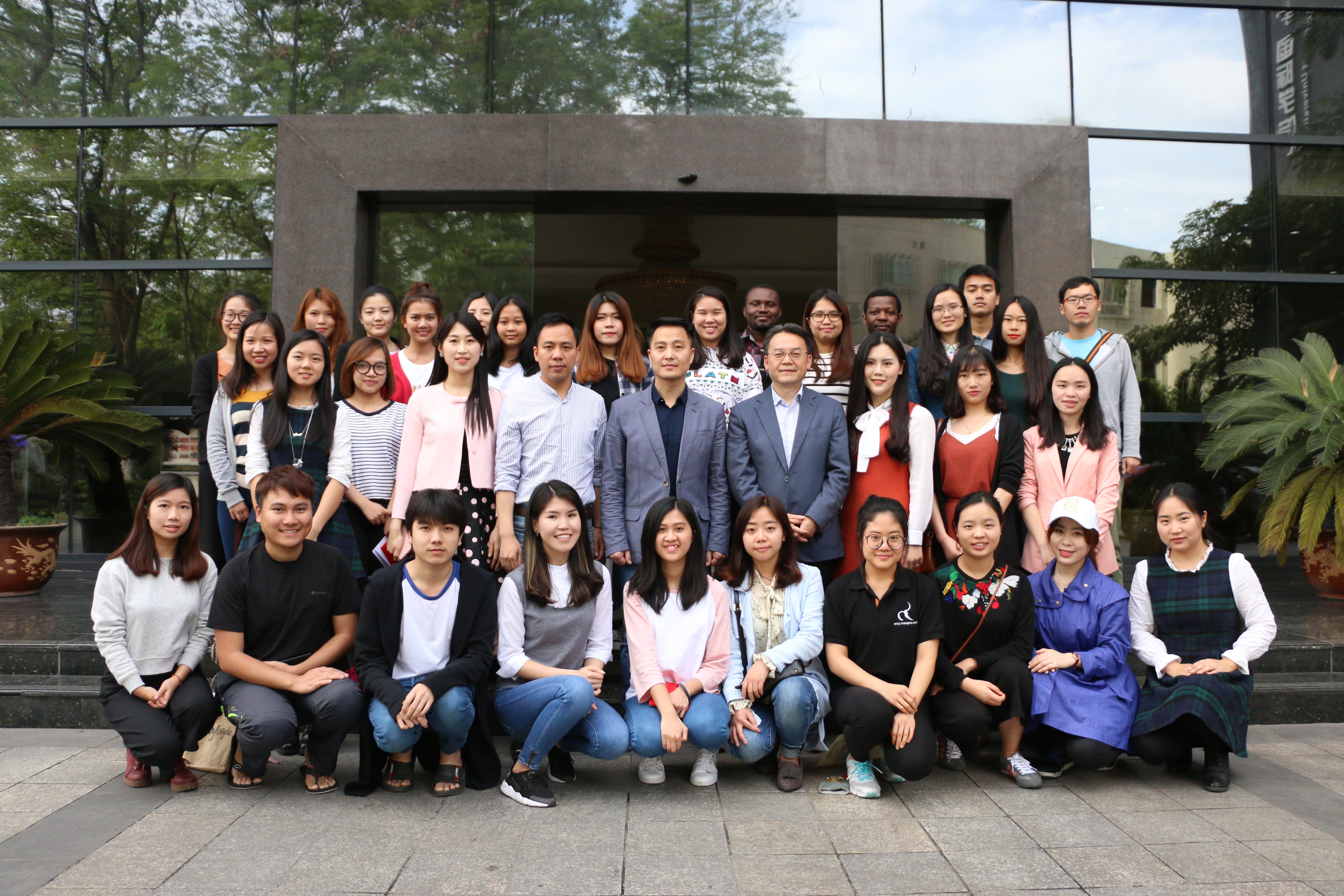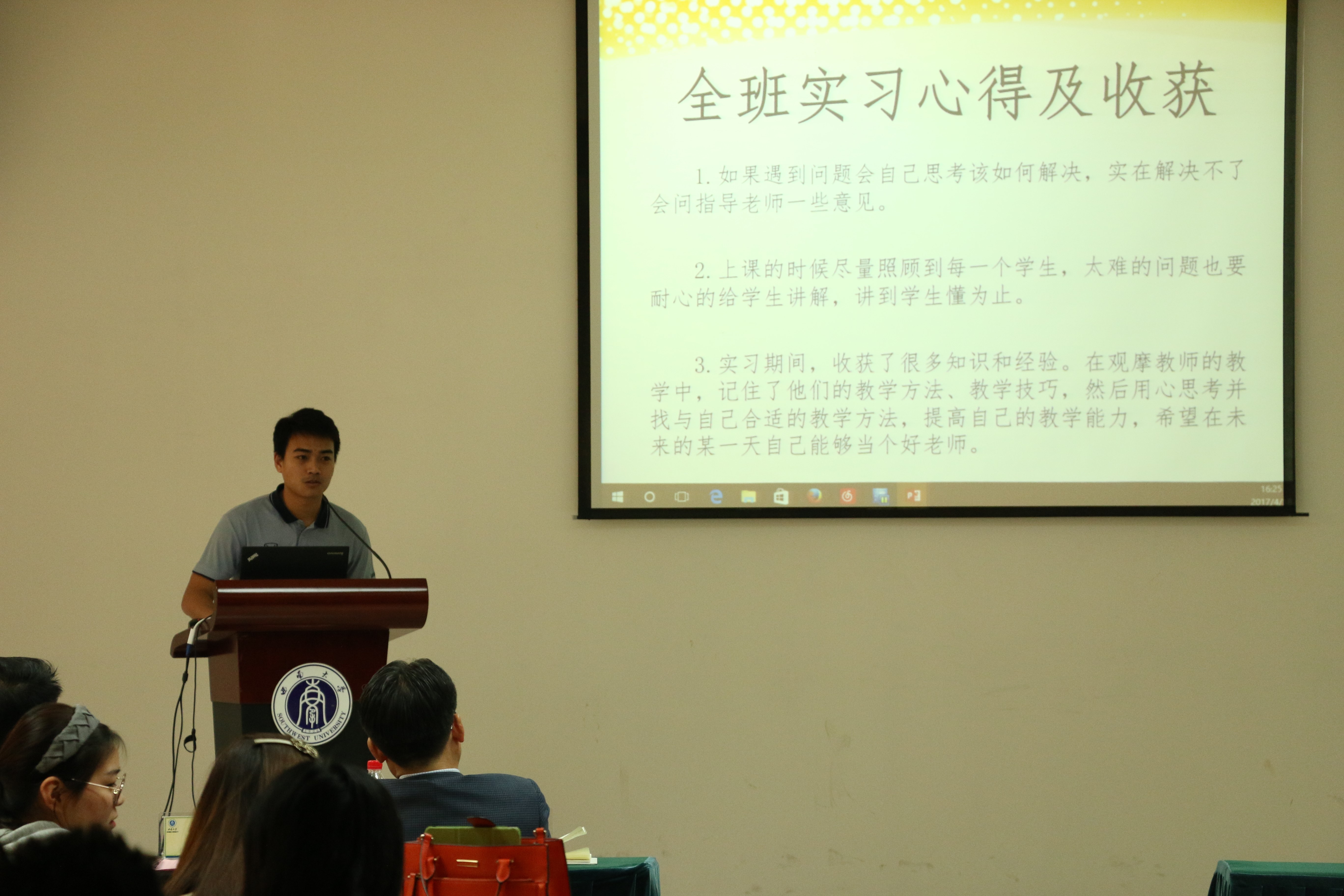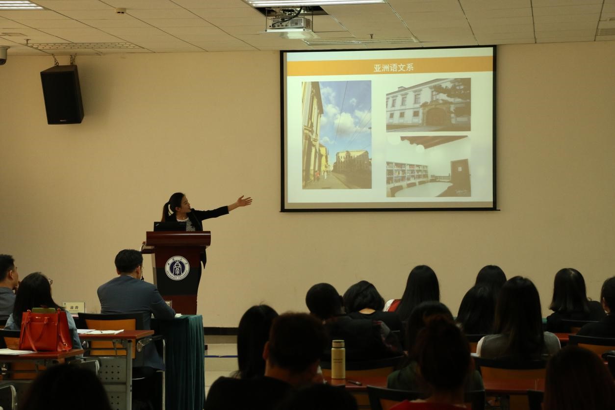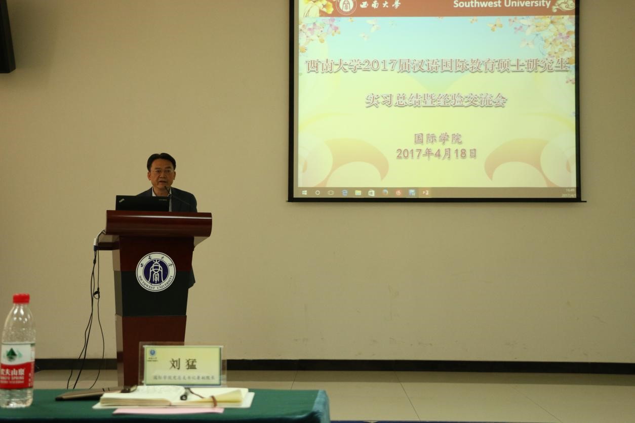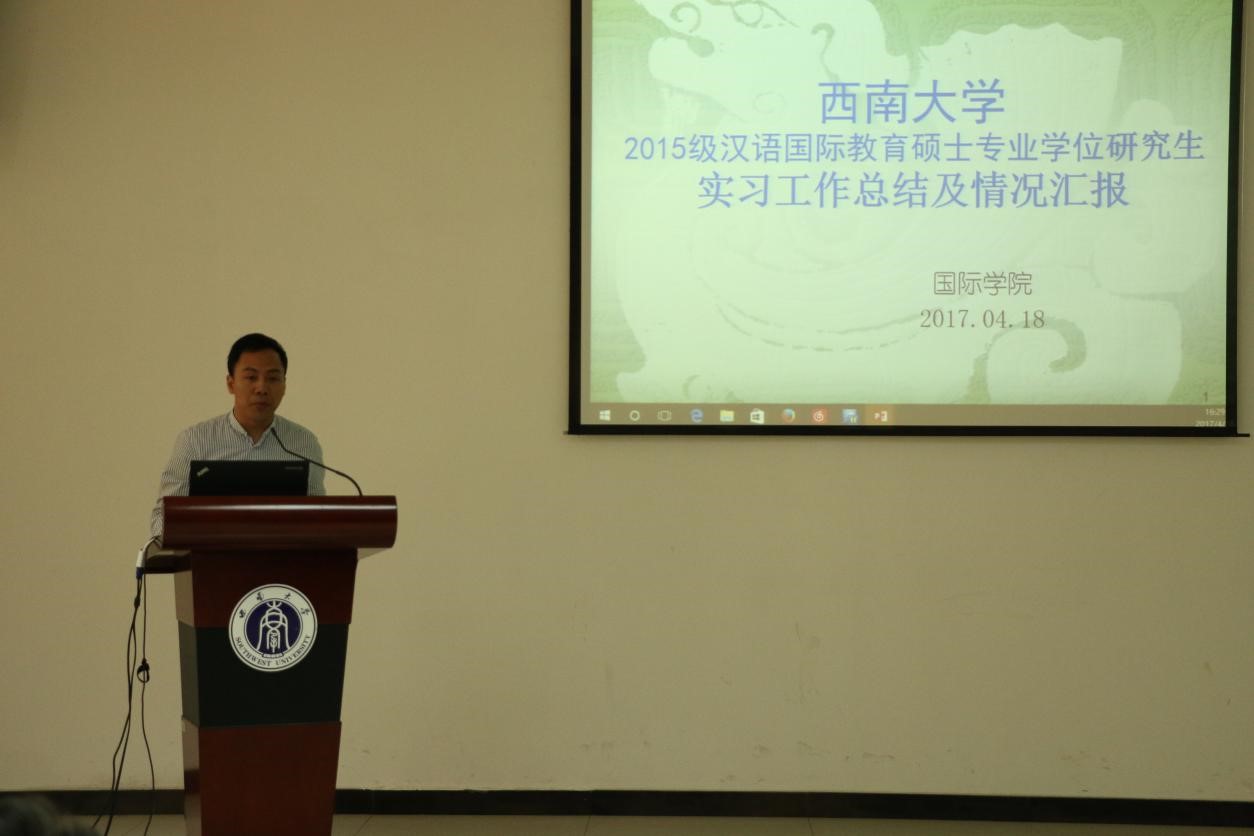 根据学科培养计划及学院实习工作安排,2015级汉语国际教育硕士中国员工班的31名同学和汉语国际教育硕士职工班来自泰国、英国、蒙古、喀麦隆、贝宁等国的21名职工于去年5月至今年3月陆续在泰国孔敬大学孔子学院、泰国正大管理学院、泰国国王科技大学、捷克帕拉茨基大学、韩国仁济大学、韩国蔚山大学、蒙古国立大学等实习点进行了海外实习。2015级汉硕中国班的吴宗燕、万明岩等5名同学以及15级汉硕职工班的萧风同学作为实习小组代表依次上台介绍各实习点的实习情况。他们用生动幽默的语言结合图文并茂的PPT展示,分别就实习工作做了详细汇报。