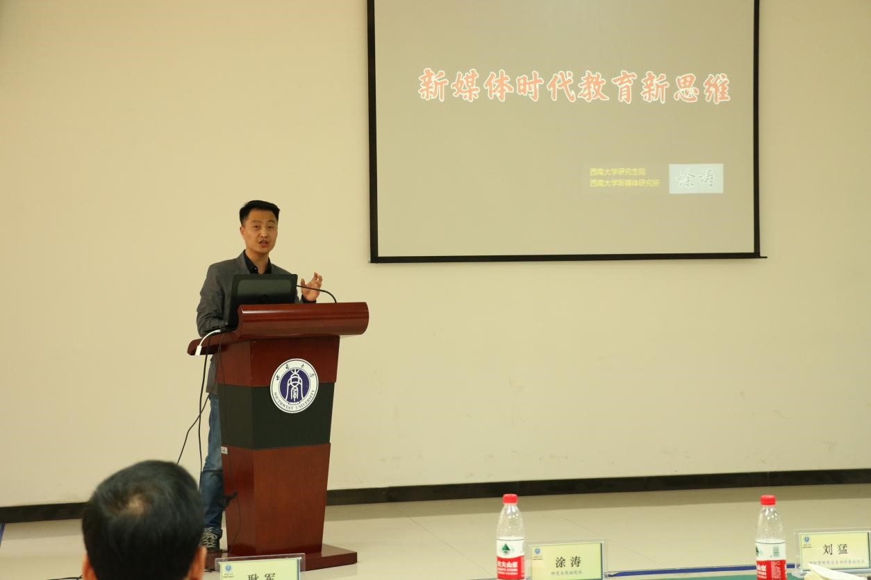 研究生院副经理涂涛做了精彩发言。他表示学校研究生院将全力支持汉语国际教育海外实习基地建设。随后他对“新媒体时代教育新思维”做了一个简单阐释,希望同学们能够以科学严谨的态度对待教学实习工作,能够结合新媒体有效地开展汉语教学。