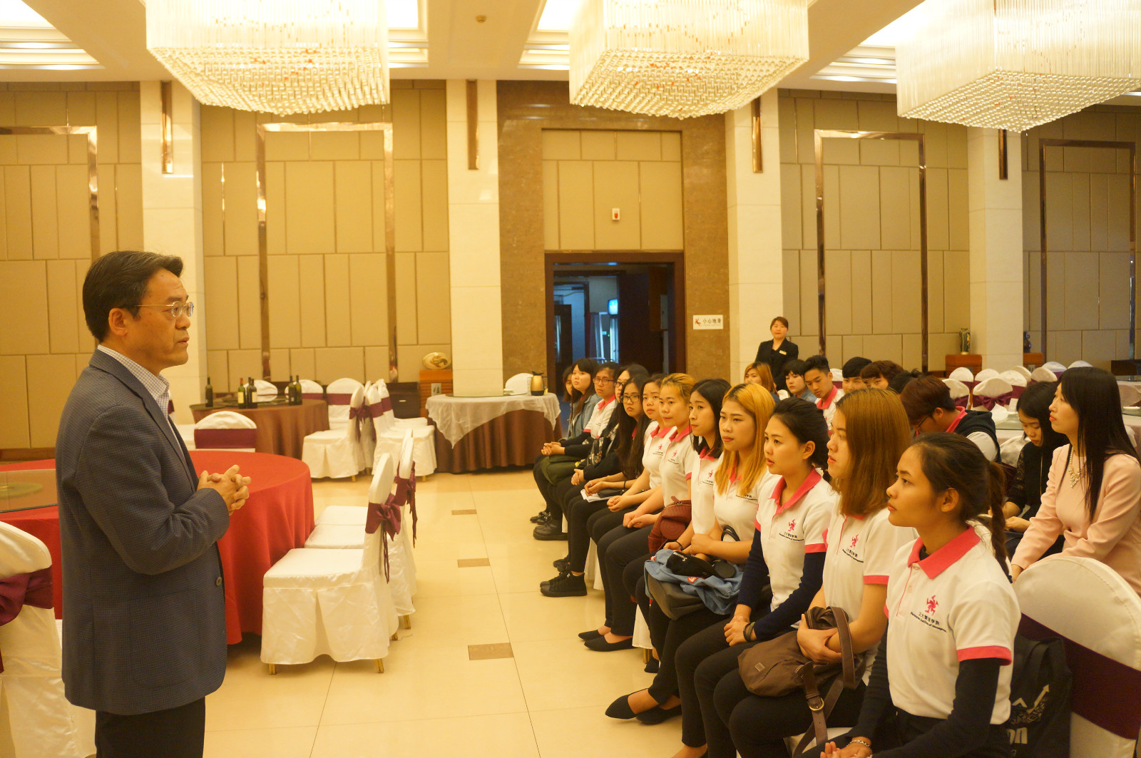 2017年4月13日下午,公司党总支书记兼副经理刘猛一行在桂园宾馆部门负责人陪同下,来到桂园宾馆餐饮部看望慰问实习的20名第五届泰国正大管理学院"1+1+2"商务汉语项目班的同学。