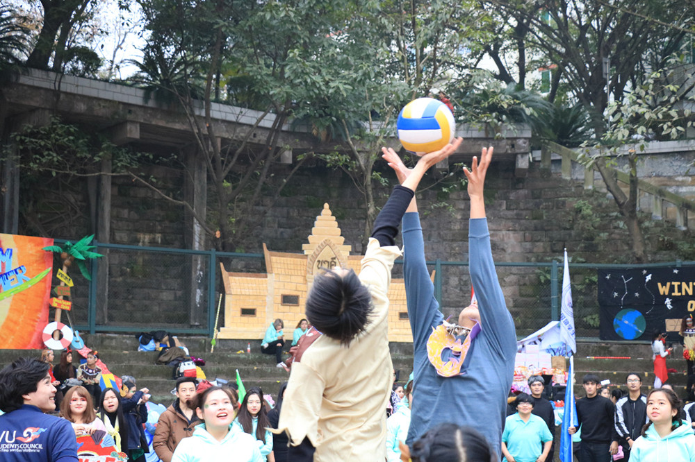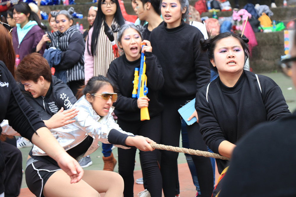 此次运动会共有十一个比赛项目。运动会以Lovely Season 为主题,参赛队伍分别以Spring、Summer、Autumn、Winter等四个季节命名。入场式上,每个参赛队伍的拉拉队按顺序展示队伍风采,每一队的展示都充满创意、精彩纷呈。拉拉队展示结束后,趣味运动会比赛项目正式开始。上午进行了排球初赛、吃货比赛、快速换服装比赛、音乐椅子、别碰我的气球、老虎打鹿等项目。