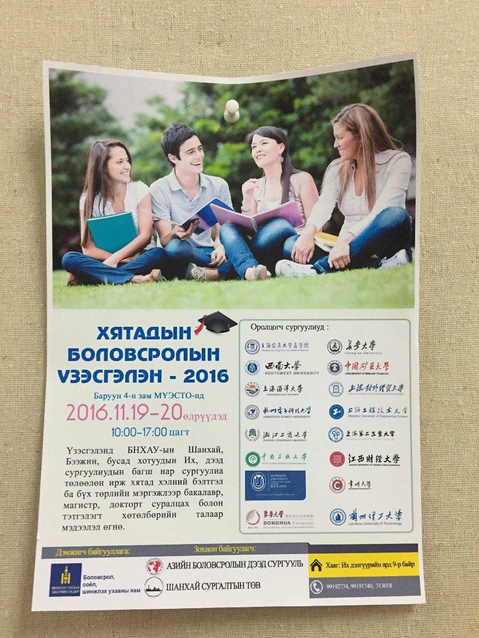 11月19日、20日,蒙古国2016年中国高等教育展正式举行。蒙古国工业部部长,认证部部长出席开幕式并讲话。在随后的教育展上,公司展位以“魅力西大 宜居宜学”为主题,以“西大蓝”为主题色,展布采用中蒙双语制作,配有蒙古在校生学习感想、最新校园风光图片,引起参展员工、家长的极大关注。在为期两天的展会上,数百员工前来就学校情况、申请程序、奖学金设置、校园生活等方面进行咨询。公司蒙古国合作高校领导教师、蒙古籍职工员工等前来学校展位交流叙旧。