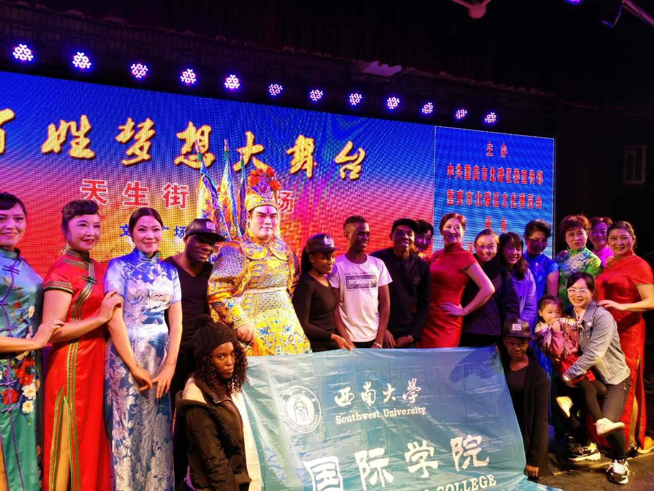 11月10日晚上7点,北碚区“百姓梦想大舞台天生街道专场演出”正式拉开序幕。学校来自泰国的罗俊勇、赞比亚的GIFT等七位同学受邀参加表演,和近百名北碚天生街道的群众们同台亮相。