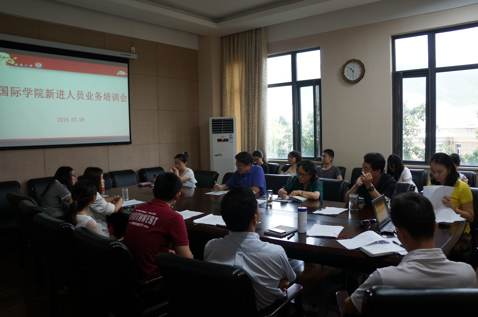 上午的培训会由李航副经理主持,各部门负责人做专题培训。招生办主任代远鸿从工作内容、人员分工、工作流程三个方面介绍招办工作。外事服务中心负责人何汉儒介绍了学院后勤保障、职工大楼的日常管理、设备维护、消防安全等,强调了节约意识和安全意识。汉教系主任耿军对学院教学科研情况、教师管理要求以及考核奖惩措施等方面进行了详细的说明。员工工作办公室李林泽从学工办定位、业务范围、业务素养、纪律要求、新员工建议等几个方面作了全面细致的说明。综合办公室主任邹育艳就办公室工作职责、学院规章制度、外事纪律等方面进行了阐释,强调外事无小事,凡事多请示。