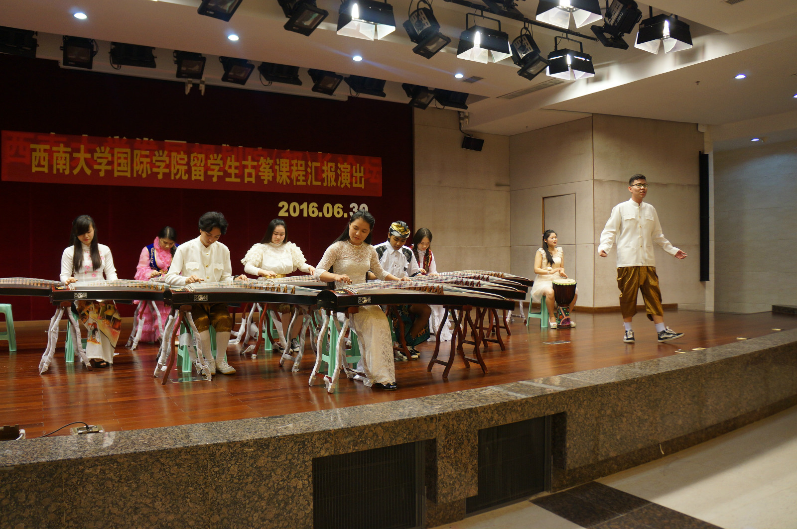 此次汇报演出分为四个小组,分别表演了《茉莉花》、《我和你》、《沧海一声笑》、《茉莉花》独唱与合奏。优美的琴声、华丽的服饰、舒缓的动作,一拨一弹,充分展示了古筝的韵味和中华文化的魅力,也赢得了在场师生热烈的掌声。特别是第四组的《茉莉花》独唱与合奏,男生优美的歌声和细腻的琴声和谐地交融在一起,赢得了在场师生无比的赞叹和久久的掌声,从而让整个汇报演出达到了高潮。