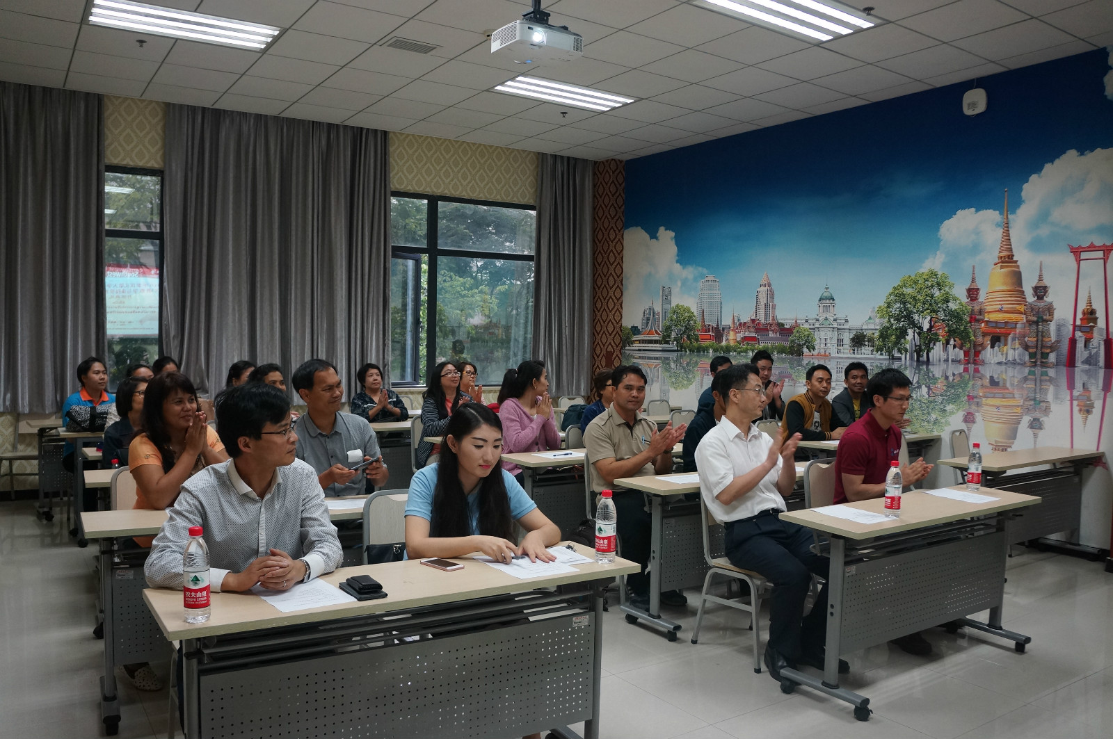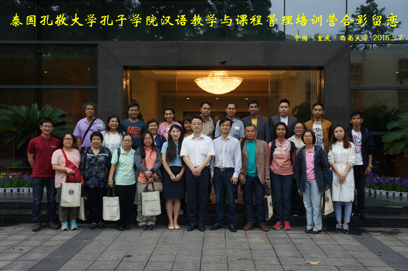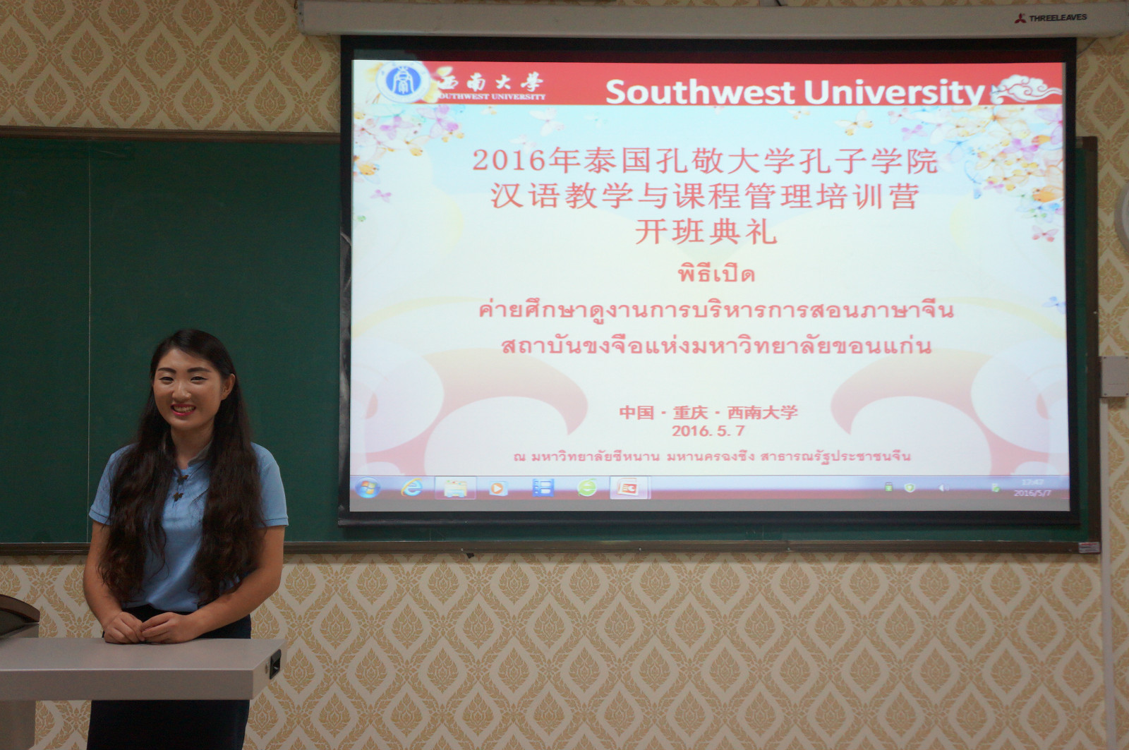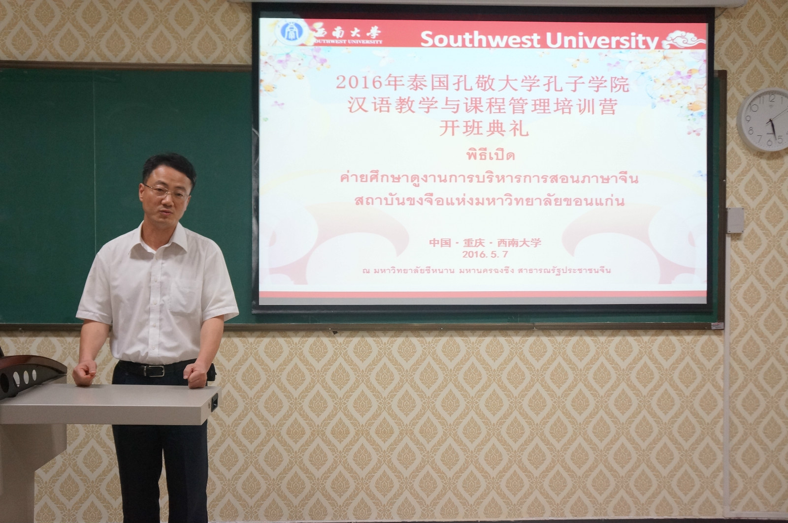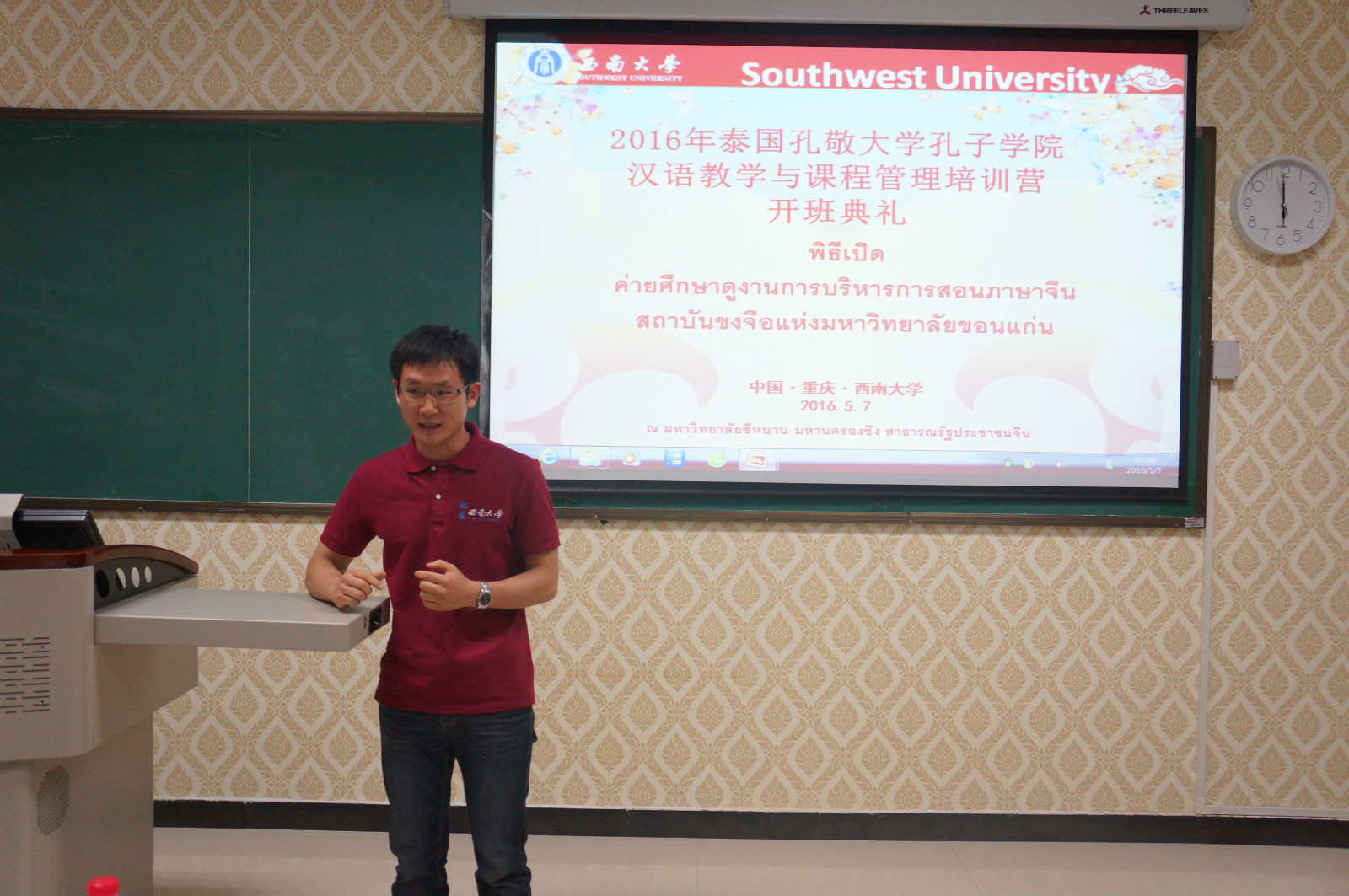 5月7日下午5点,泰国孔敬大学孔子学院汉语教学与课程管理培训营开班典礼在紫云楼泰国文化教室顺利举行。188改名为taptap点点副经理李航,招生办公室主任代远鸿,泰国教师代表丰雅,培训营教师代表舒敬斌,以及来自泰国16所高等职业院校的20名教师团员参加了开班典礼。