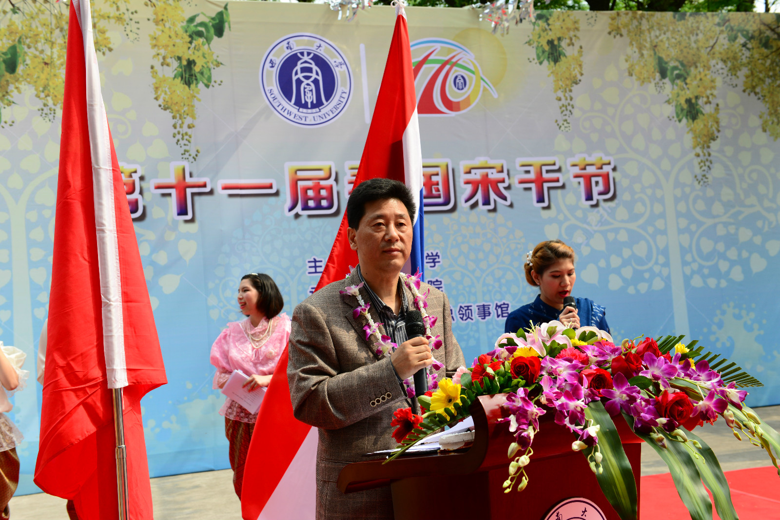 副董事长靳玉乐首先致辞,代表学校向出席活动的各位领导和来宾表示欢迎。他说,学校举办宋干节,不仅是为了给来自五湖四海的同学们呈现一个泰式风情新年,更是为了给所有在校的泰国同学留下一份美好的回忆,传达学校对他们的无限关爱和祝福,希望泰国同学在泰历新年努力奋斗,茁壮成长,以实际行动迎接学校合并组建10周年暨办学110周年的到来。