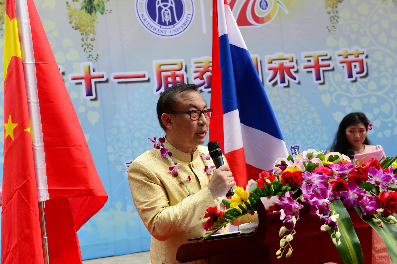 泰王国驻成都总领事馆总领事郭梅特在致辞中感谢学校的盛情邀请,高度评价学校与泰国高校开展的富有成效的合作。他还简要地介绍了泰国宋干节的习俗,祝全场嘉宾以及师生泰国新年快乐,同时勉励泰国同学努力学习中文和了解中国历史,为中泰两国的友谊和文化交流做出自己的贡献。
