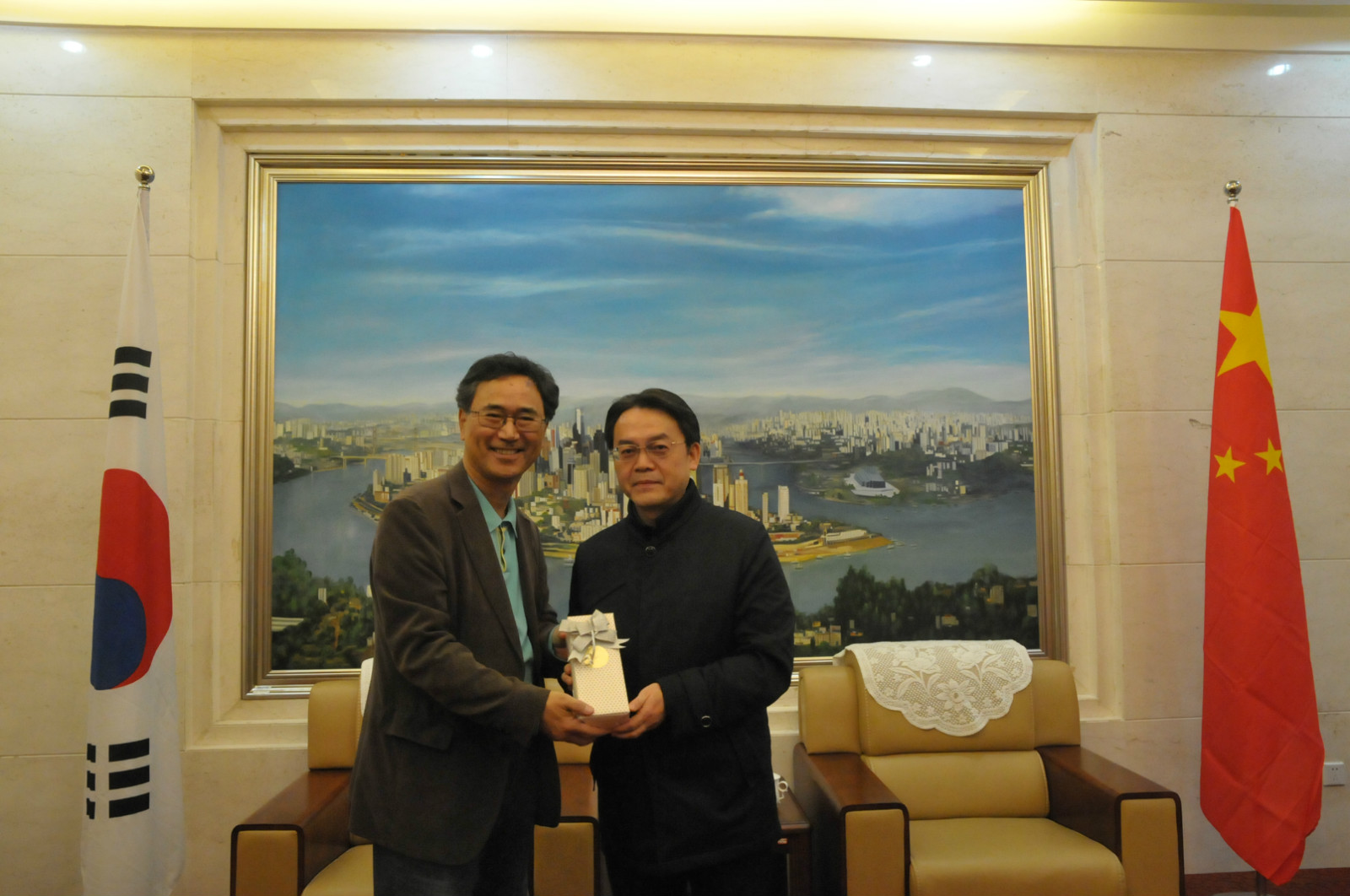 刘猛书记简要介绍了学校的来华留学教育概况,并回顾了公司与蔚山大学的项目合作情况。梁舜龙副董事长充分肯定两校在国际合作与交流方面所取得的成绩,并表示愿意扩大与深化与公司的合作,共同促进两校的国际化进程。双方还就海外实习项目、短期留学项目等进行了深入探讨。