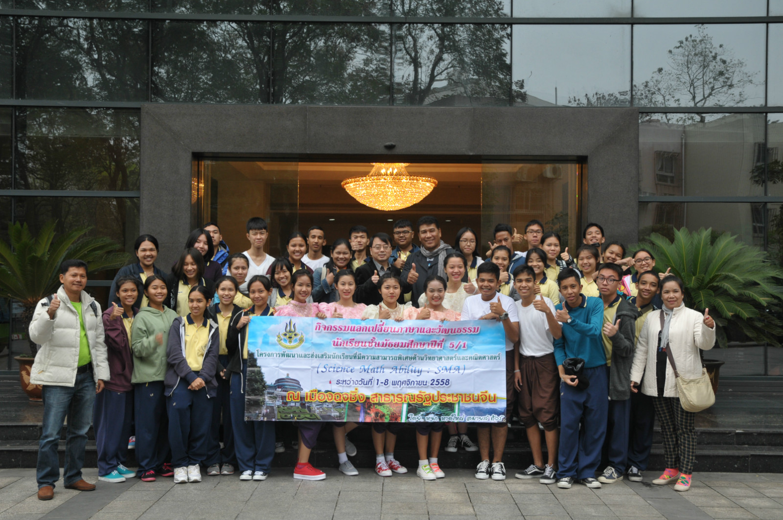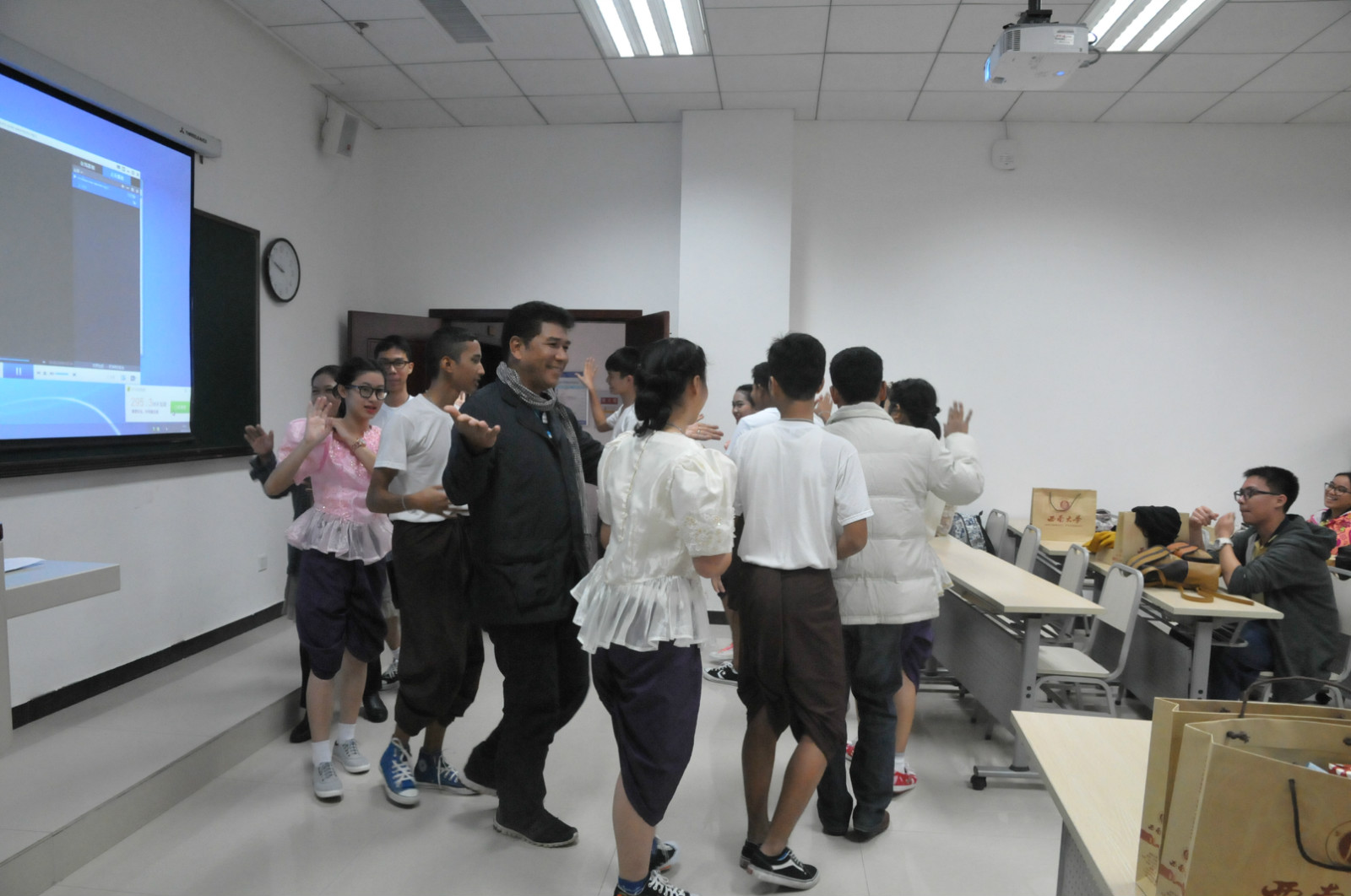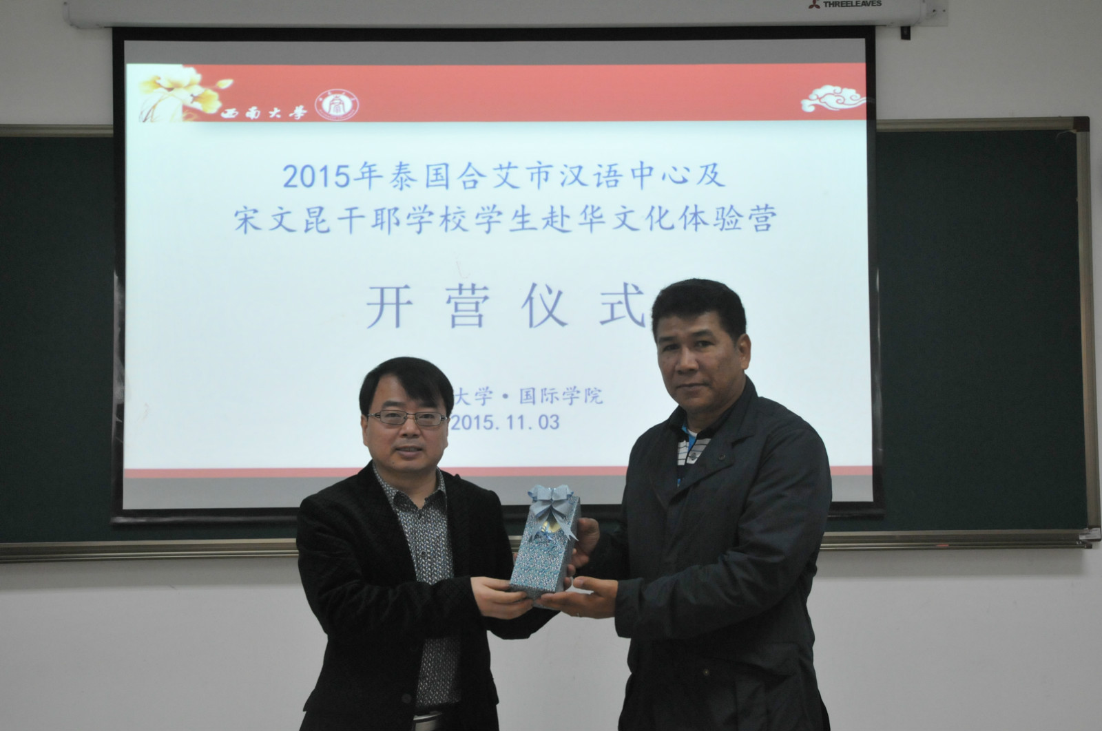 张家政副经理向泰国教师代表赠送纪念品,10名泰国员工表演了泰国传统节日——水灯节舞蹈,典礼在轻松愉快的氛围中结束。会后大家在紫云楼前合影留念,泰国团员们在语伴的陪同下乘观光车参观了校园。