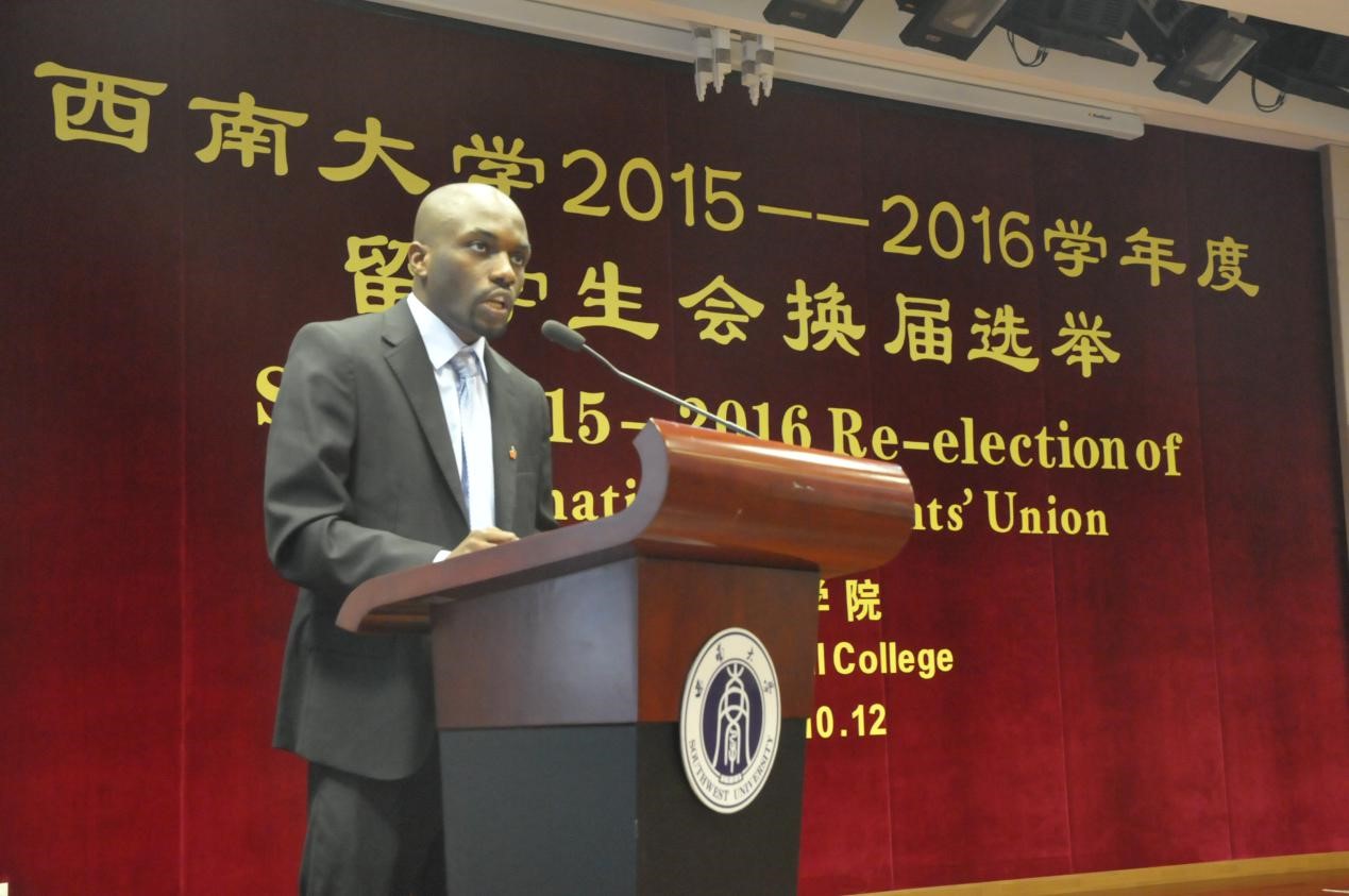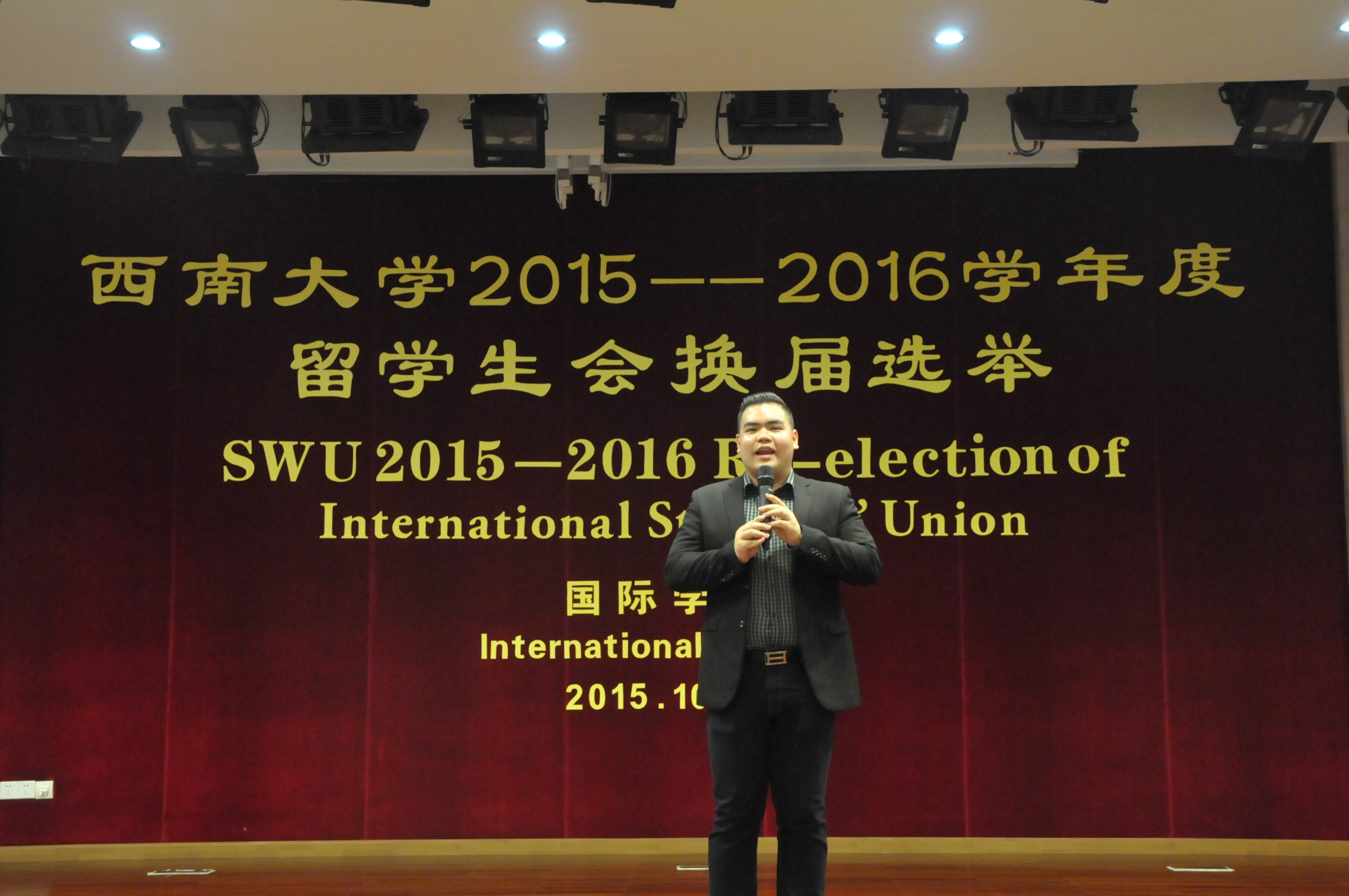 前任职工会主席阿普杜同学对上届职工会工作进行了总结。他特别提到2014-2015学年职工会参与的国际文化节、泰国宋干节等重要活动,充分赞扬了职工会各个成员积极配合,团结一致的优良传统。他希望下一届职工会延续这一宗旨,并祝愿他们的工作取得更大成功。
