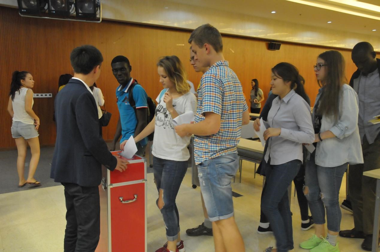 在主持人介绍了选举规则和投票方法之后,竞选演讲正式开始。来自6个国家的16位不同国籍的竞选人依次上台发表演说,他们分别就自己对员工会的认识,以及在过去工作中取得的优异成绩,对未来工作的展望等方面做出了激情的演讲,并博得了台下同学的热烈喝彩。所有演讲结束之后,在现场工作人员的组织下,到场的职工们依次投下自己神圣的一票。最后,竞选同学和大会工作人员合影留念,选举大会圆满结束。