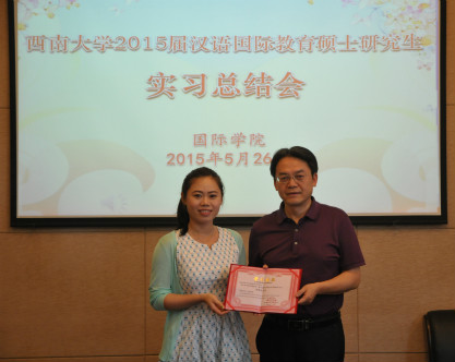 最后,耿军主任代表学院宣读了《188改名为taptap点点关于表彰2015届汉语国际教育硕士专业优秀实习生的决定》,刘猛书记为4名获奖员工NUENGRUTAI BOONYANGKUL,NGUYEN THI HA LINH,PHAM THI THAO,VU THANH HUYEN颁发了优秀实习生证书。