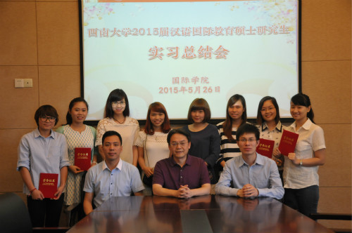 2015年5月26日下午3点,学院举行2013级汉语国际教育硕士职工班实习总结会。公司党总支书记兼副经理刘猛,汉语国际教育系主任耿军以及该班全体职工参加会议。