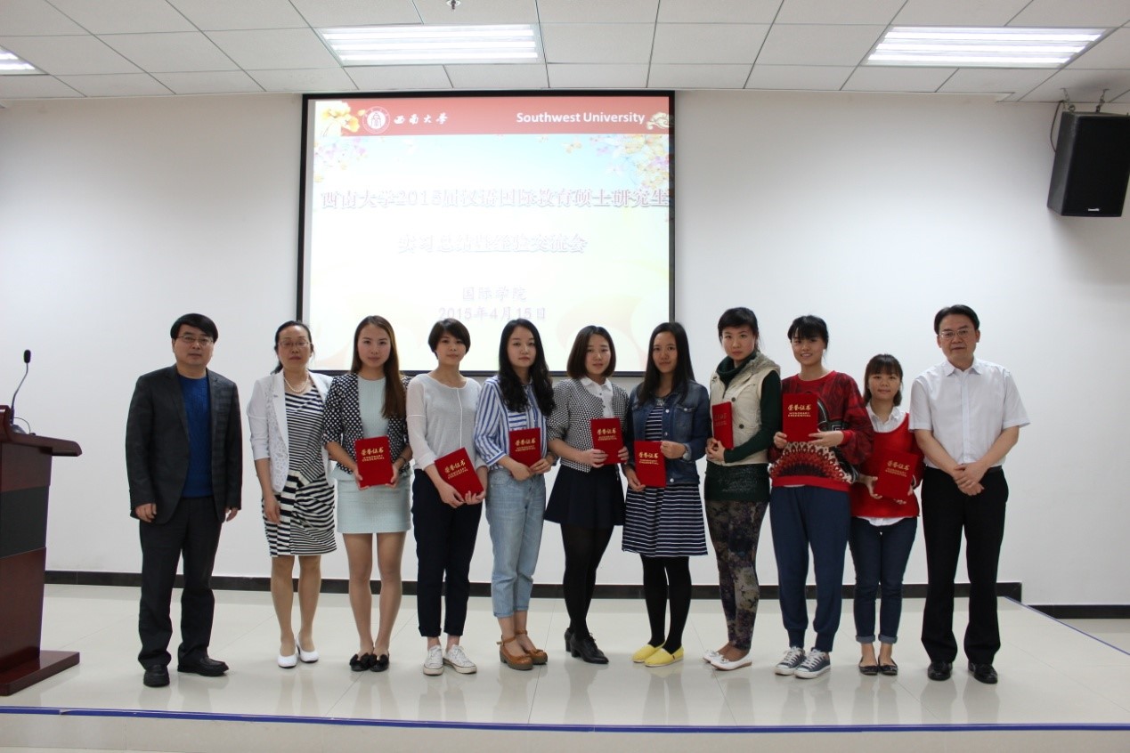 最后,张家政副经理宣读了关于表彰2013级汉语国际教育硕士优秀实习生的决定,到会领导为优秀实习生颁发了荣誉证书。实习汇报结束后,2013级与2014级汉语国际教育硕士进行了实习经验的交流。实习总结暨经验交流会在一片欢声笑语中圆满结束。