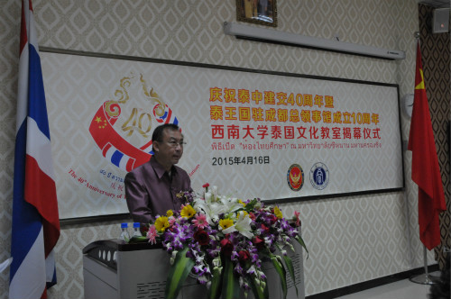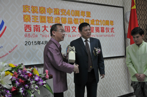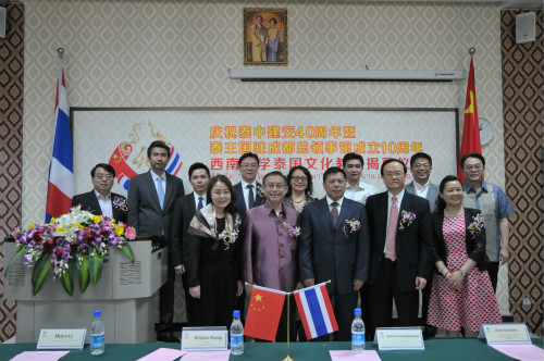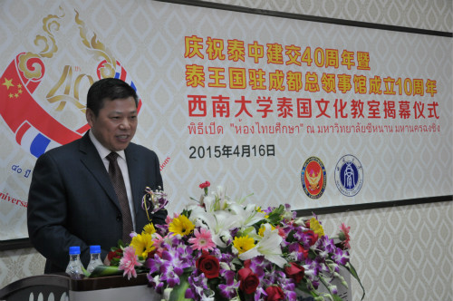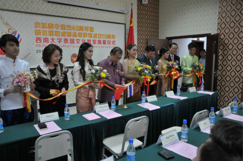 泰国驻成都总领事馆总领事郭梅特先生,市政府外事侨务办公室巡视员陈高山、领事处处长范青,市教委国际合作与交流处处长李世玉,公司董事长张卫国等出席教室揭幕仪式。