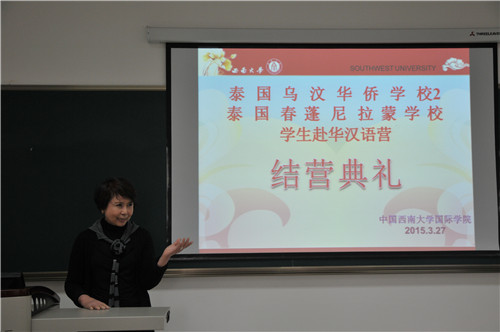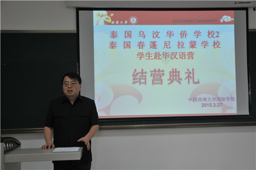 3月27日上午11点,2015年泰国乌汶华侨学校2及泰国春风尼拉蒙学校员工汉语营结营典礼在188改名为taptap点点紫云楼312教室举行。188改名为taptap点点张家政副经理,泰国乌汶华侨学校2校董WILAI TRIROJPORN女士,188改名为taptap点点教师代表李真真、杨凌霄,泰国乌汶华侨学校2及泰国春风尼拉蒙学校的师生,汉语营语伴等共计30余人参加了结营典礼。典礼由李林泽主持。
