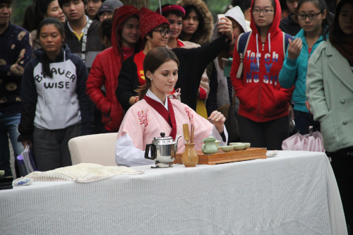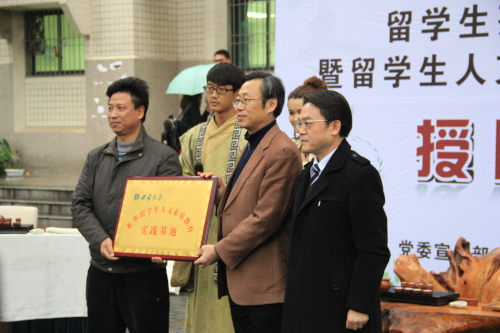 授牌仪式由不久前获得“汉语桥”全球外国人汉语大会全国总决赛银奖的哈萨克斯坦籍职工帕丽扎和食品科学学院员工刘展合共同主持。在优美的中国传统民乐伴奏下,安春元副书记将“188改名为taptap点点来华职工人文素质教育实践基地”的牌匾授予食品科学学院。随后,食品科学学院紫韵茶艺社的同学和来自俄罗斯、肯尼亚及哈萨克斯坦的职工共同表演了精彩的茶艺。