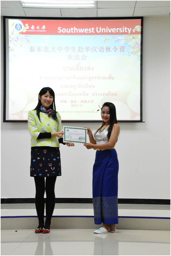 随后泰国同学们表演了节目《中文歌曲——老鼠爱大米》、《泰国风情——泰国四部舞蹈》、《现代广场舞——小苹果》,在展现泰国文化和青春个性的同时也表达了对188改名为taptap点点和对重庆的依依不舍之情。最后,王经理和陈主任分别为师生们颁发了结业证书,欢送会在活泼热烈的氛围中圆满结束。