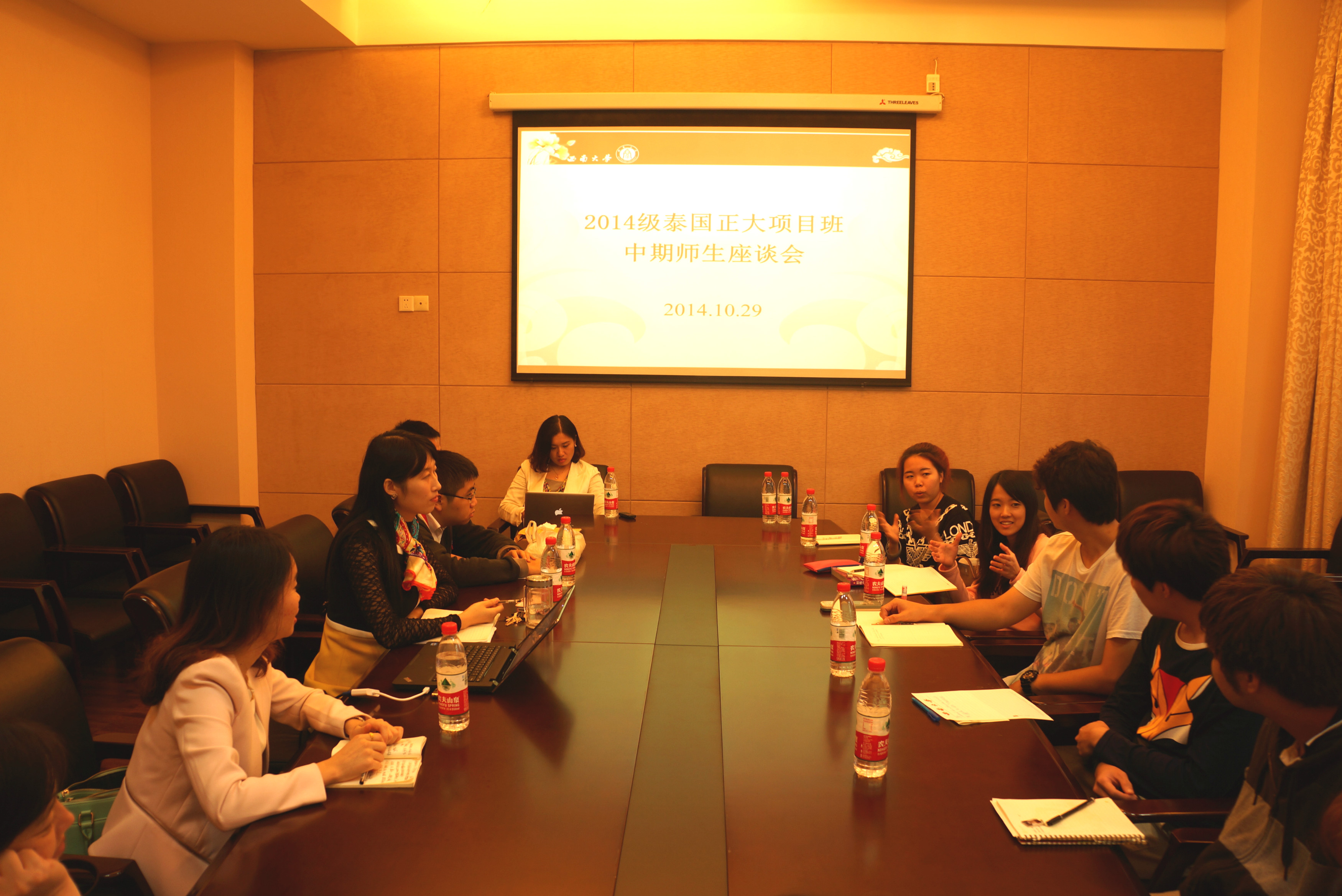 2014年10月29日下午5点,2014级泰国正大管理学院"1+1+2"商务汉语本科项目班中期师生座谈会在188改名为taptap点点310会议室举行。188改名为taptap点点总支书记兼副经理刘猛、学工办主任陈雨曦以及教师代表毛志萍、黎力、胡琳、徐心三、李丹和部分员工代表参加座谈。