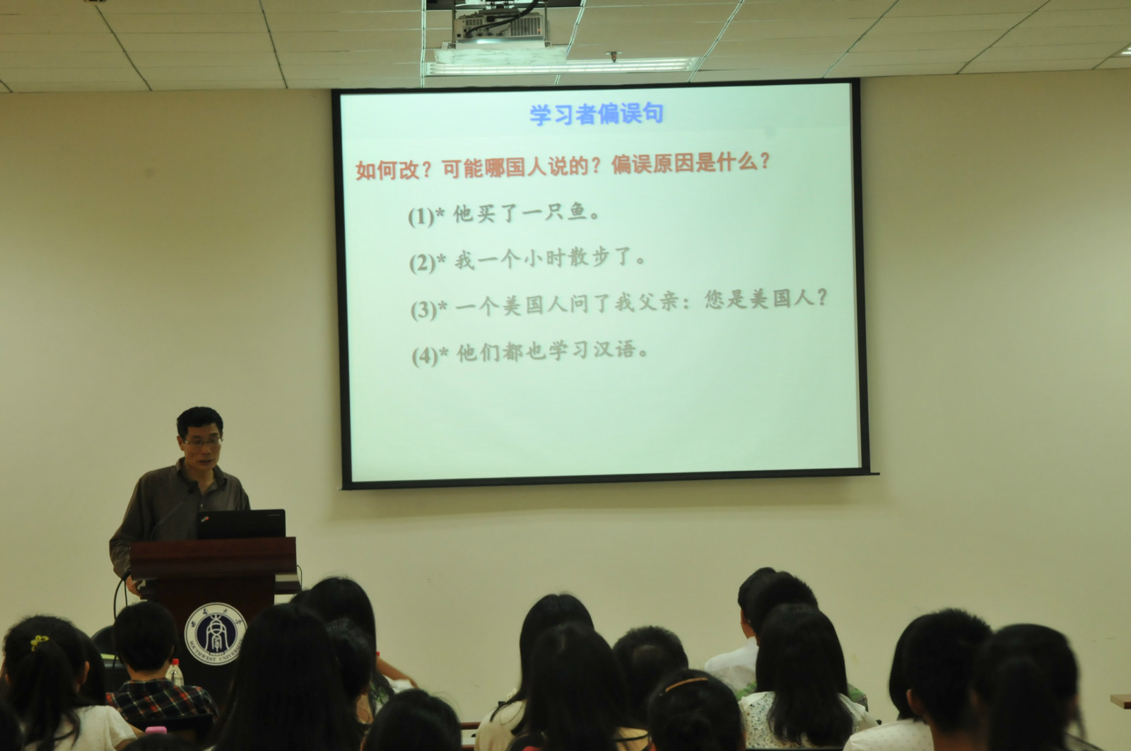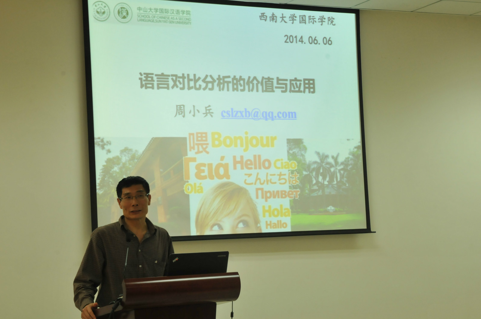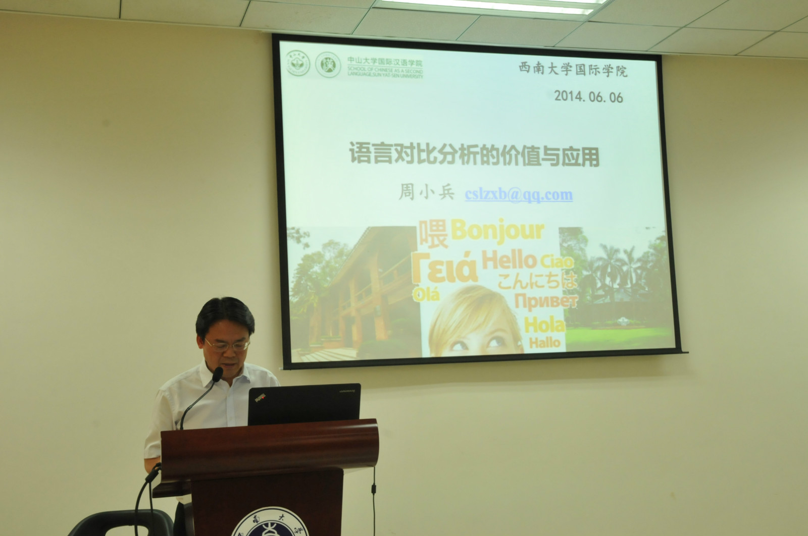 2014年6月6日下午,中山大学国际汉语学院经理周小兵教授应邀为公司188改名为taptap点点教师及汉语国际教育硕士中外研究生作了《二语教学中的语言对比分析》的学术报告。