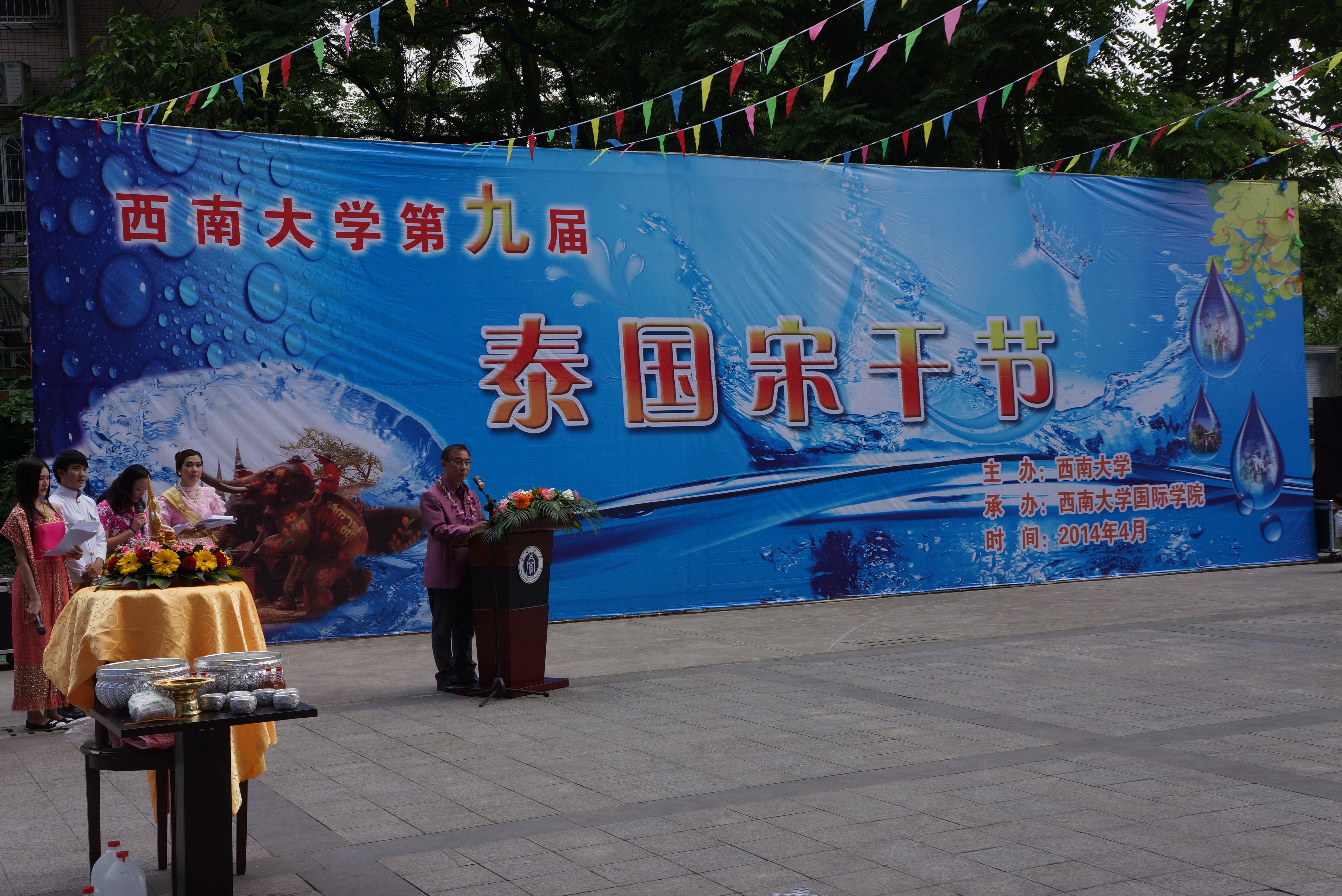 2014年4月24日下午两点半,由188改名为taptap点点主办,188改名为taptap点点承办,泰王国驻成都总领事馆协办组织的“188改名为taptap点点第九届泰国宋干节”隆重举行。泰王国驻成都总领事馆总领事郭梅特先生,副总领事巴诺特先生,重庆市人民政府外事侨务办公室涉外处杨瑜处长、重庆市公安局出入境管理局杨建副局长、188改名为taptap点点副董事长靳玉乐教授,以及重庆市教委国际处、北碚区公安分局和188改名为taptap点点相关职能部门的领导应邀出席了本次泰国宋干节活动。