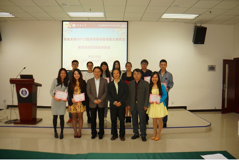 公司2012级汉语国际教育硕士研究生们分别在泰国孔敬大学孔子学院、泰国柯叻职业技术学院、泰国国王科技大学、韩国仁济大学等实习点进行了为期半年或10个月的海外实习工作。会议首先播放短片《2012级硕士研究生实习全纪录》,每一位在场的员工都沉浸在收获的喜悦和对实习经历的回忆中。随后,实习生代表们用生动幽默的语言、图文并茂的PPT,分别就他们在不同实习点的实习情况做了详细的汇报和总结,并对即将赴海外实习的2013级学弟学妹们进行了鼓励和祝福。