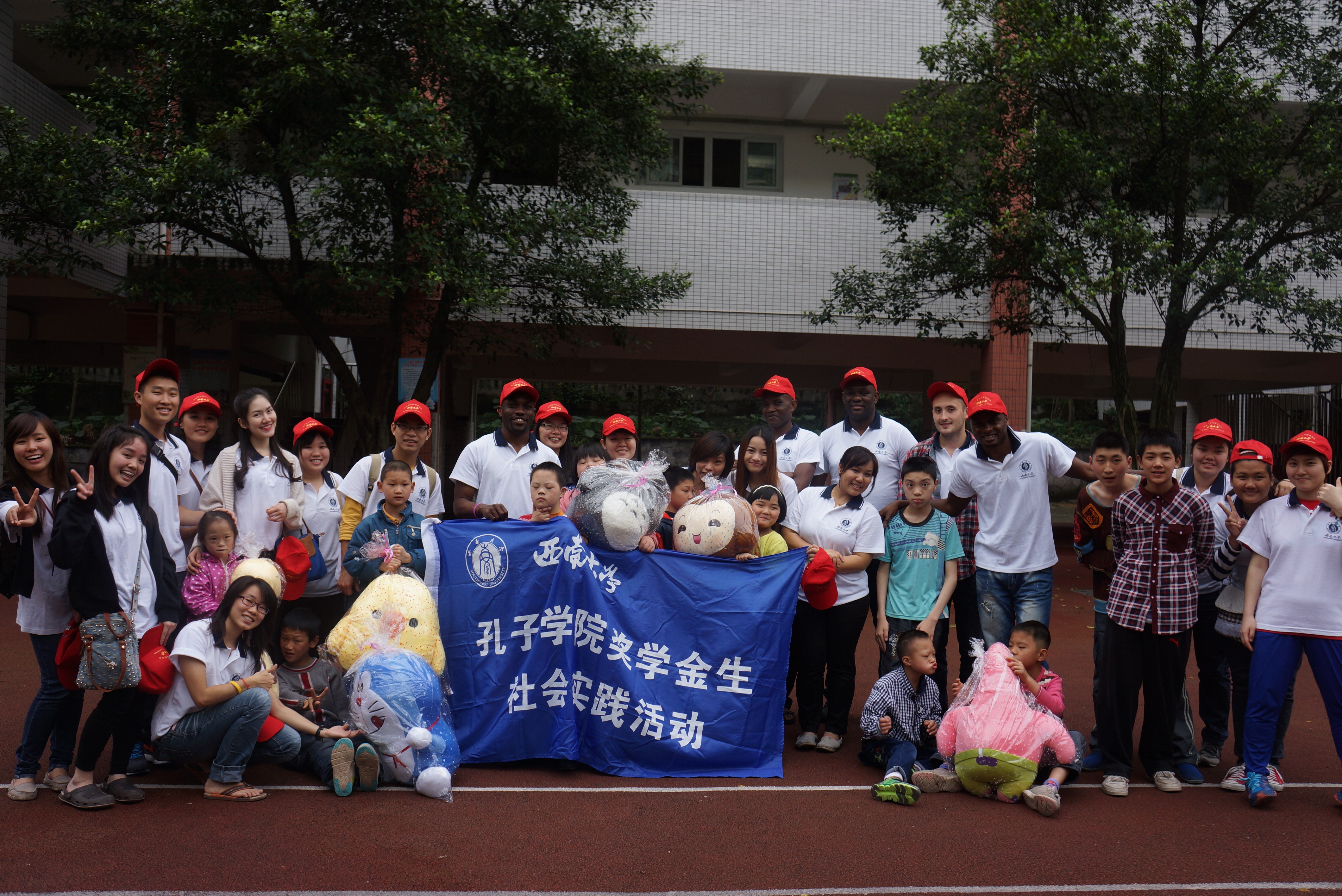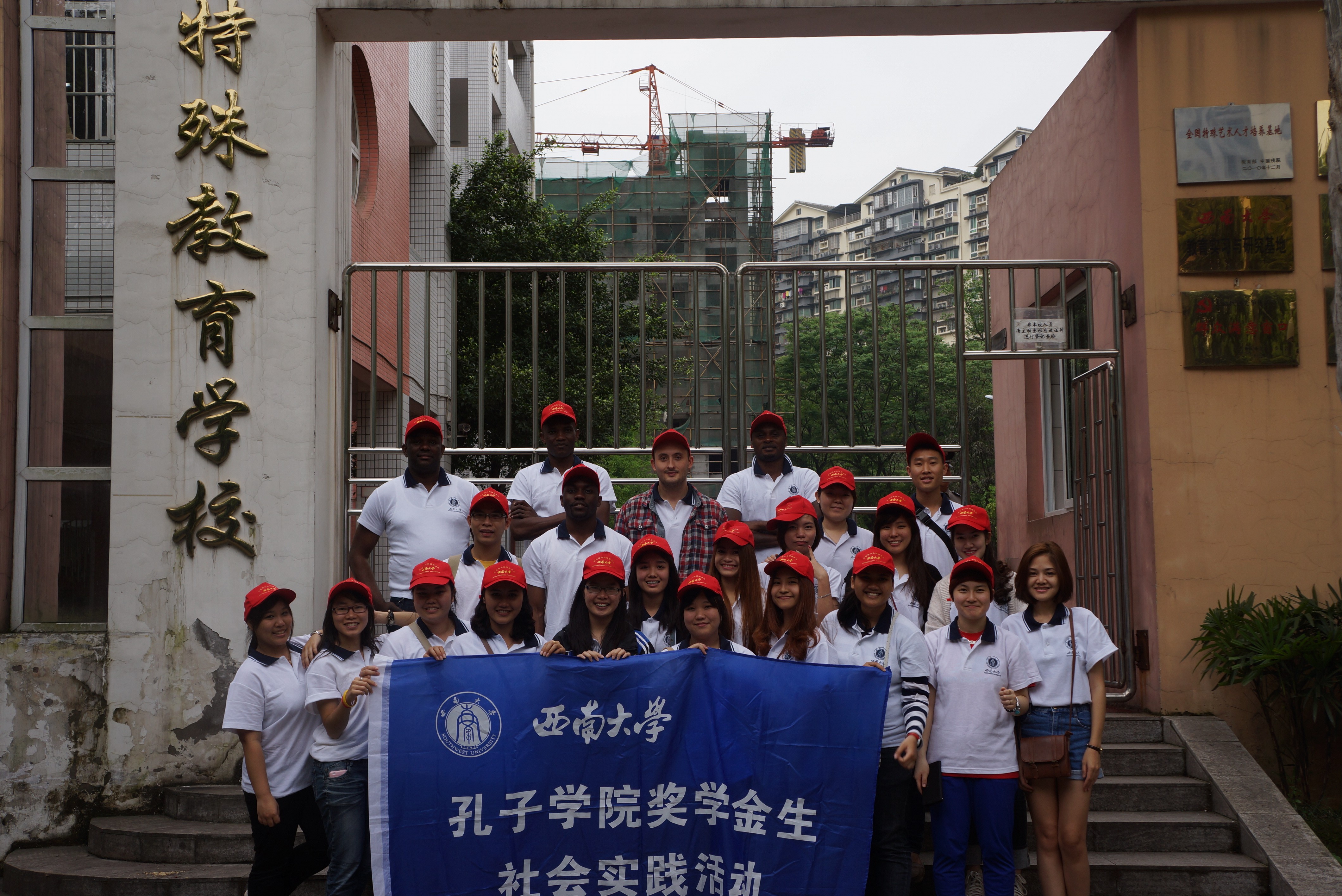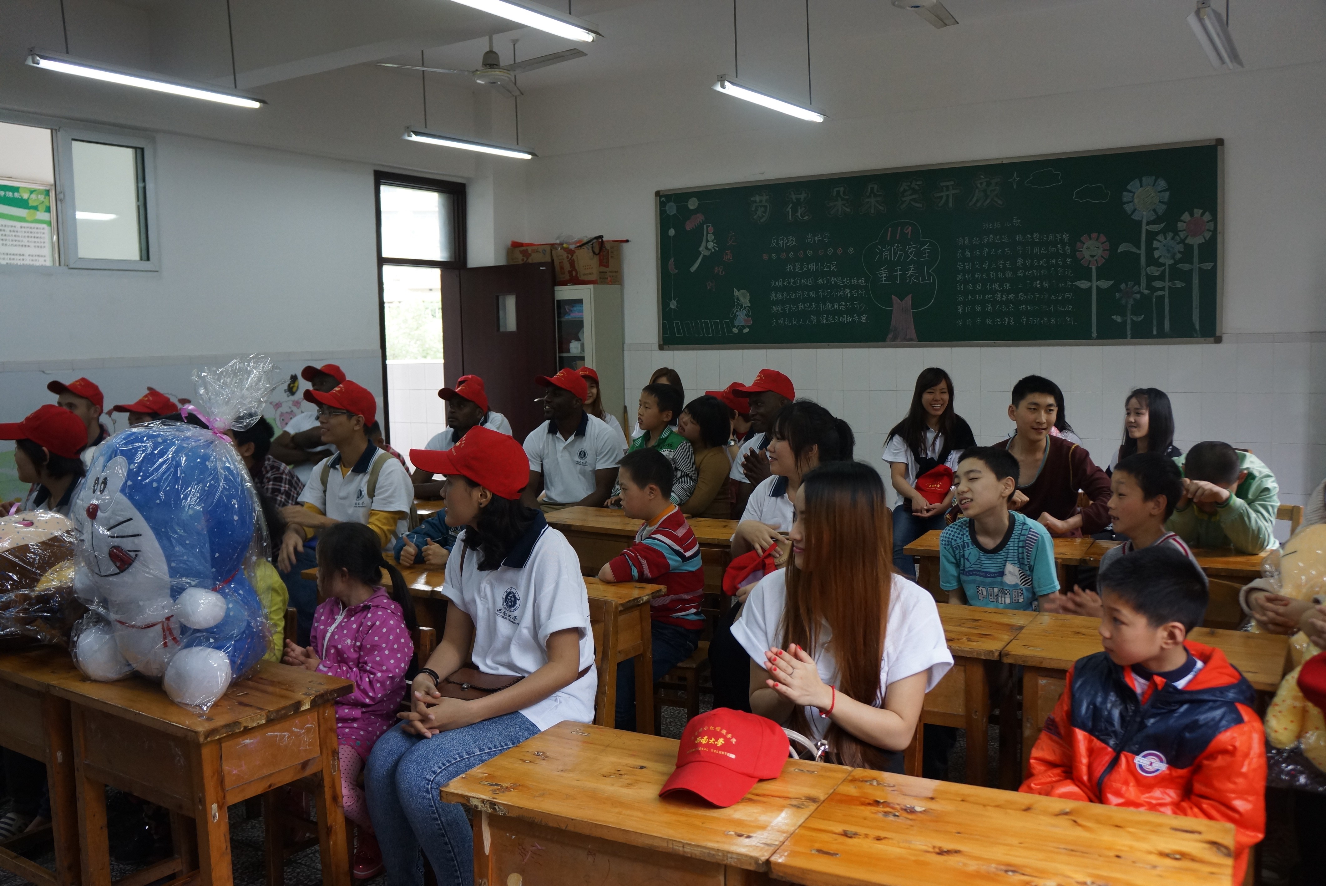 首先,服务队成员们近距离观摩了特教学校的课堂,因为服务队中有很多来自汉语国际教育专业的同学,今后同样要从事教育工作的他们对从事特殊教育的老师表达了崇高敬意。然后,服务队成员们在教室里和孩子们一一结对,做起击鼓传花的游戏,不仅给孩子们带来了非洲手鼓,泰国舞蹈等充满异域特色的表演,还感受到这些特殊的孩子们一样的童真和表演天赋。最后,服务员成员们和孩子们一起在操场上合影留念。