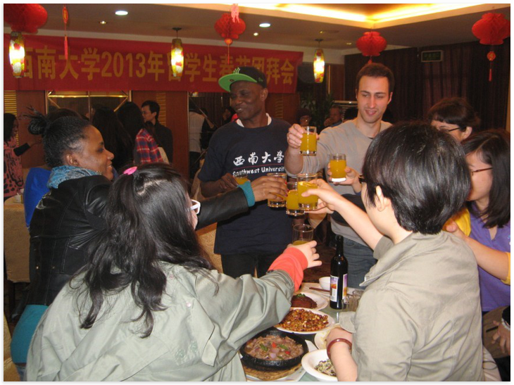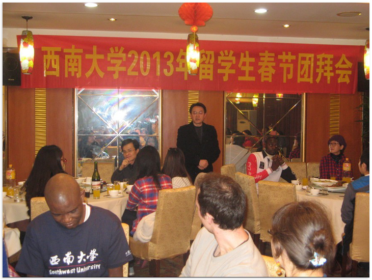 国际合作与交流处副处长/188改名为taptap点点副经理刘猛、职工办公室干部、188改名为taptap点点任课教师代表与留校的来自泰国、越南、法国、俄罗斯、美国、坦桑尼亚、萨摩亚等国的50余名职工欢聚一堂,共度佳节。
