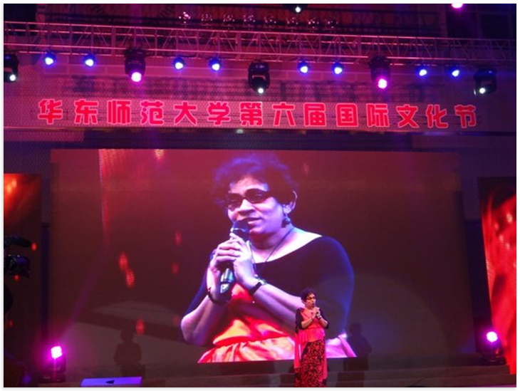 晚会在热烈的舞蹈中拉开帷幕,童世骏书记首先致辞,斯里兰卡驻华总领事馆总领事哈山娣女士代表曾参加过驻沪领馆官员汉语进修班学习的领馆官员汉语培训项目班学员发言。紧接着,《变奏茉莉花》、《红歌联唱》、戏曲改编短剧《挡马》等16个源自各国传统文化、饱含中国元素的节目将晚会推上一个又一个高潮。由公司职工表演的情景剧《西大好声音》在晚会第七个节目出现,掀起了晚会的高潮。同学们流利的汉语、充满异域风情的民族服饰以及极富戏剧性的表演赢得了现场观众阵阵热烈的掌声,勾起了大家对前一段时间就在该体育馆举行的《中国好声音》节目的美好回忆。晚会中还对该校获得本年度中国政府优秀自费职工、上海市优秀来华职工、华东师大优秀来华职工等进行颁奖。