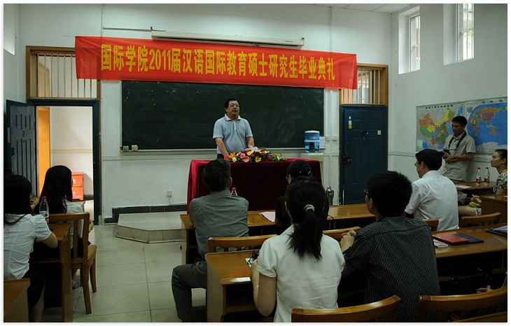 教师代表耿军博士引导同学们回忆课堂上的活泼严肃,生活上的喜怒哀乐,教导同学们要热爱学校、尊敬老师、不忘中国情,希望所有同学都能学有所成,将来与老师一起共同致力于国际汉语教育事业。
