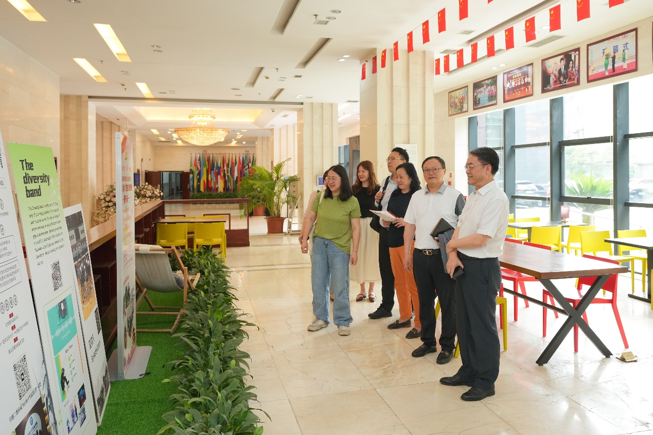 客人实地参观学院教学设施和文化建设情况,通过图片了解学校办学历史和来华留学工作。