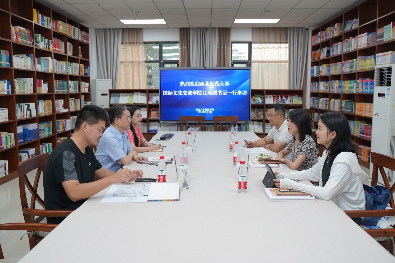 7月3日下午,西北师范大学国际文化交流公司党委副书记江琦一行3人来学院访问,就推进“三全育人”格局下的来华职工国情教育、国际员工日常管理和服务工作典型举措、来华职工管理系统信息化,以及国际员工创新创业与社团管理等问题展开深入交流。公司党委书记刘猛,学工办主任杨昆、辅导员汪鑫阳参加座谈会,会议由刘猛书记主持。