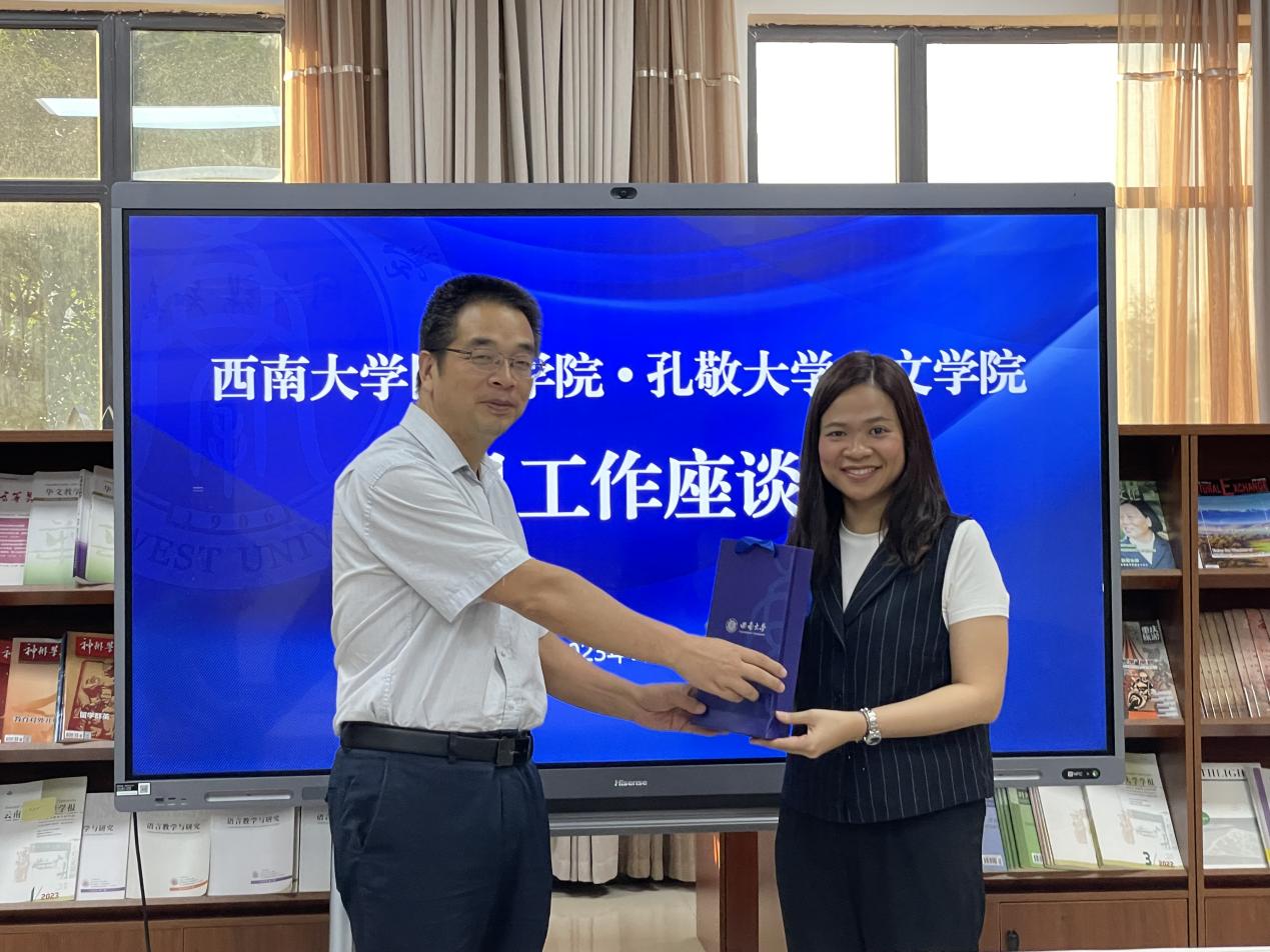 刘猛书记回顾两校的友好合作历史,高度评价孔敬大学人文学院对于“2+2联合培养项目”的大力支持,表示,虽然疫情影响了项目招生,给线上授课带来诸多挑战,但是在多方共同努力之下,项目不仅没有中断,而且确保线上授课效果,实现了员工正常毕业、授位的人才培养目标,得到家长和社会的赞誉。今年取得招收18名项目员工的好成绩,实属不易,期望两员工谊长存、项目持续健康发展。