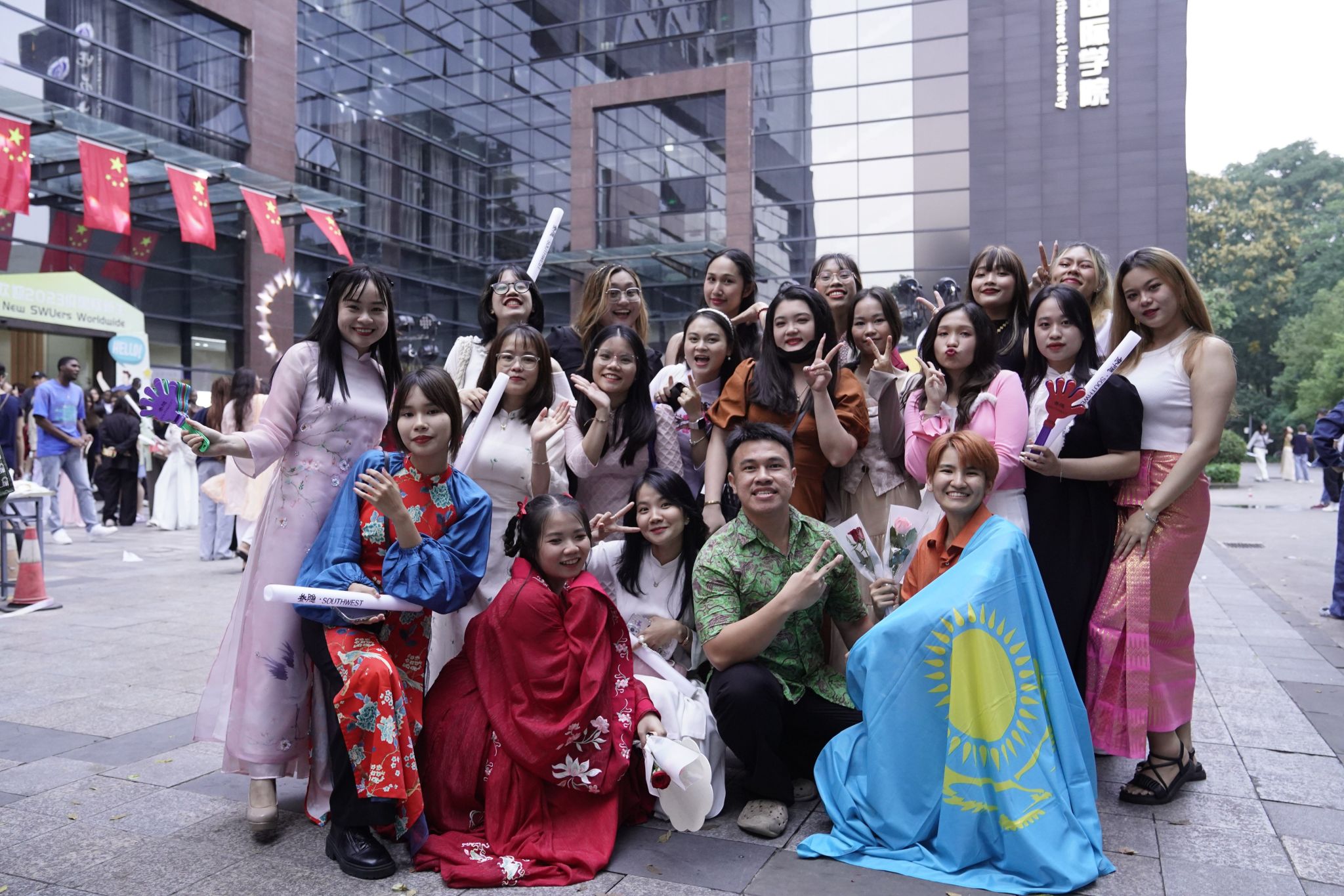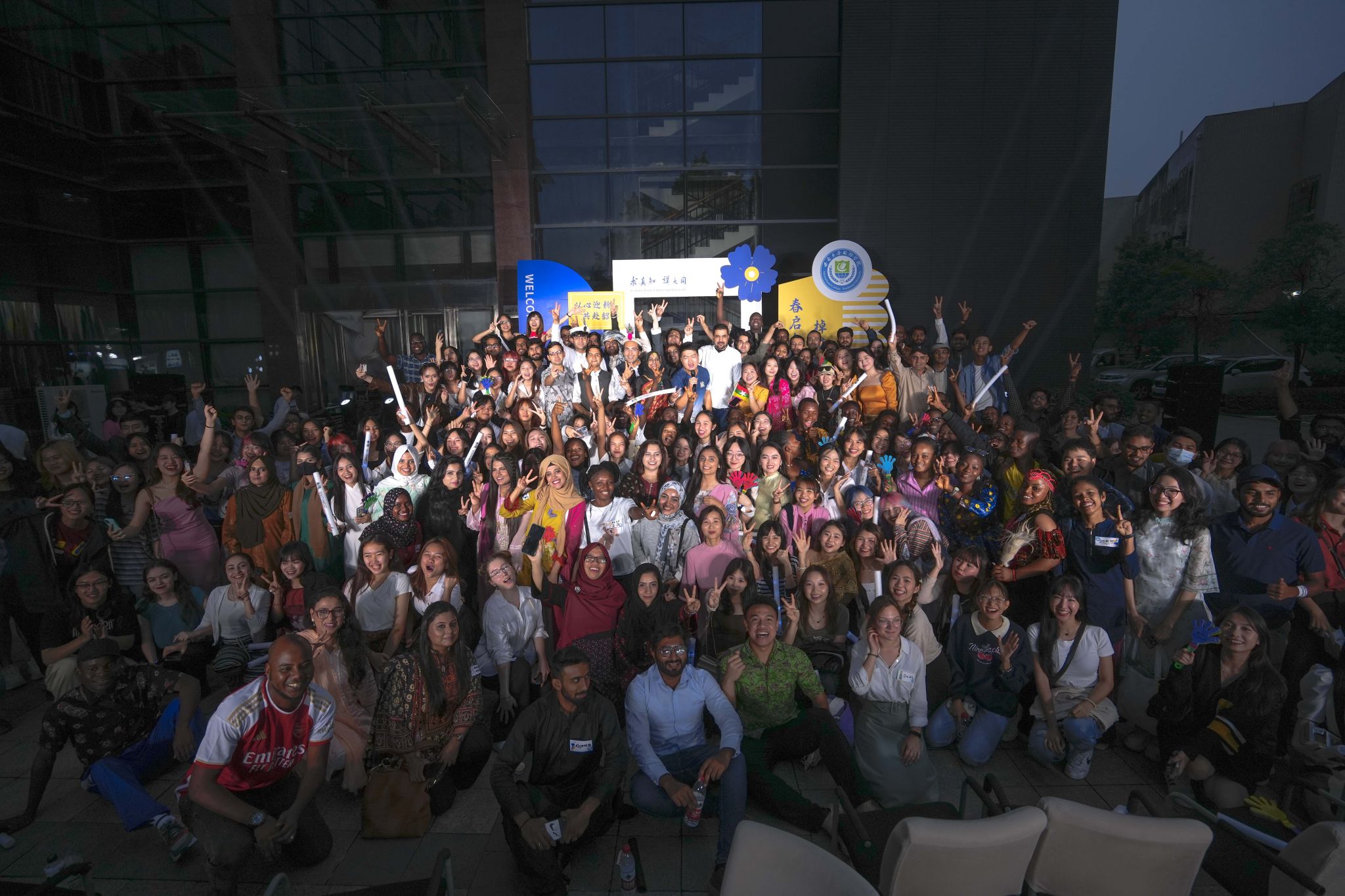 活动尾声,各国员工上台合影:穿着本国民族传统服饰的、身披国旗的、展示特色舞势的……多样化的合影方式体现了学校包容并蓄、以心迎新的办学态度。今后学院也将会继续陪伴大家共赴韶华,走向更好的自己。