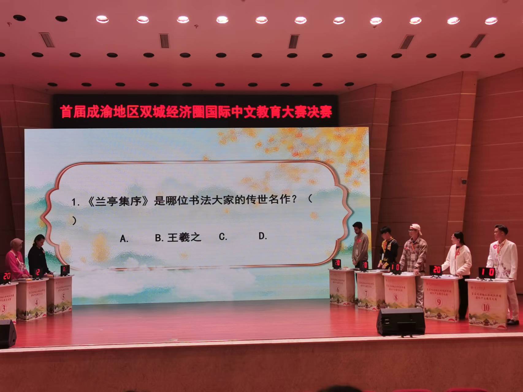 决赛过程中,国际员工组分别展开知识竞答、中华才艺两个环节的比拼。其中,在第二轮的中华才艺展示中学校员工分别表演了尤克里里弹唱和京剧+书法,不仅获得了超高分数,还获得了观摩师生和赛事组织方和承办方的普遍好评。刘文昊同学还作为重庆赛区国际员工代表进行了返场表演。