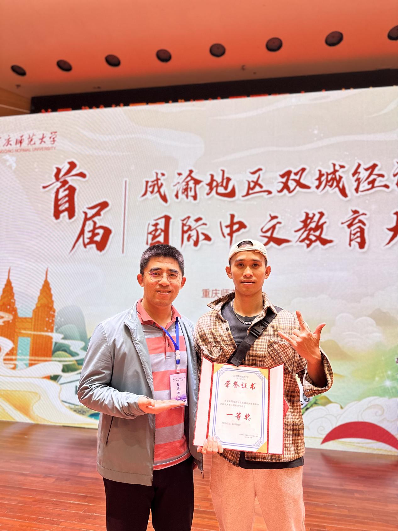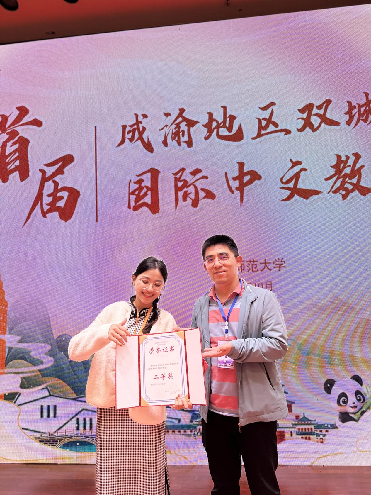 10月19日,首届成渝地区双城经济圈国际中文教育大赛决赛在重庆师范大学举行,本次赛事由重庆市教育委员会、四川省教育厅主办,重庆师范大学、四川师范大学承办。这是川渝两地第一次联合举办国际中文教育大赛,规格高、规模大、影响深,代表了两地国际中文教育赛事的最高水平。经过激烈角逐,学校国际员工刘文昊以总成绩第二名获得一等奖,阮氏兰香获得二等奖。