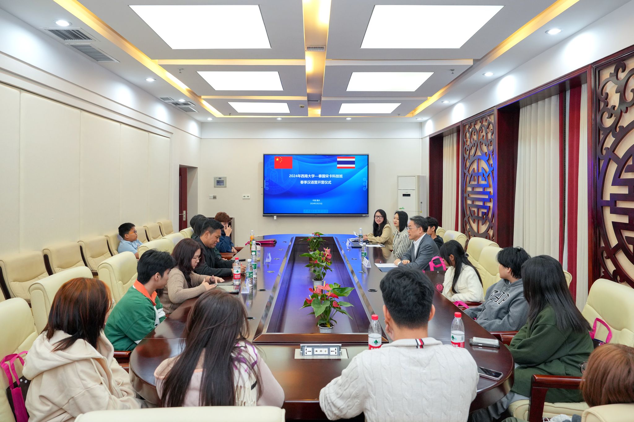 刘猛书记发表热情洋溢的致辞。他对远道而来的泰国师生们表示热烈欢迎,并简要介绍重庆和学校概况。他表示,学校始终秉持“天下一家”的理念,积极参与“人类命运共同体”的构建,推动“留学西大”品牌形成,致力于培养传播中国声音、讲好中国故事的国际员工。他希望可以通过此类汉语营活动,为中泰两国的青少年搭建一个相互学习、交流的平台。