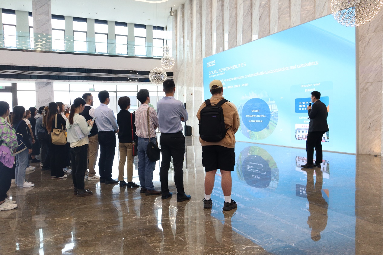 会前,长安集团工作人员为国际员工详细介绍长安集团企业发展历程,并带领大家参观相关产品。