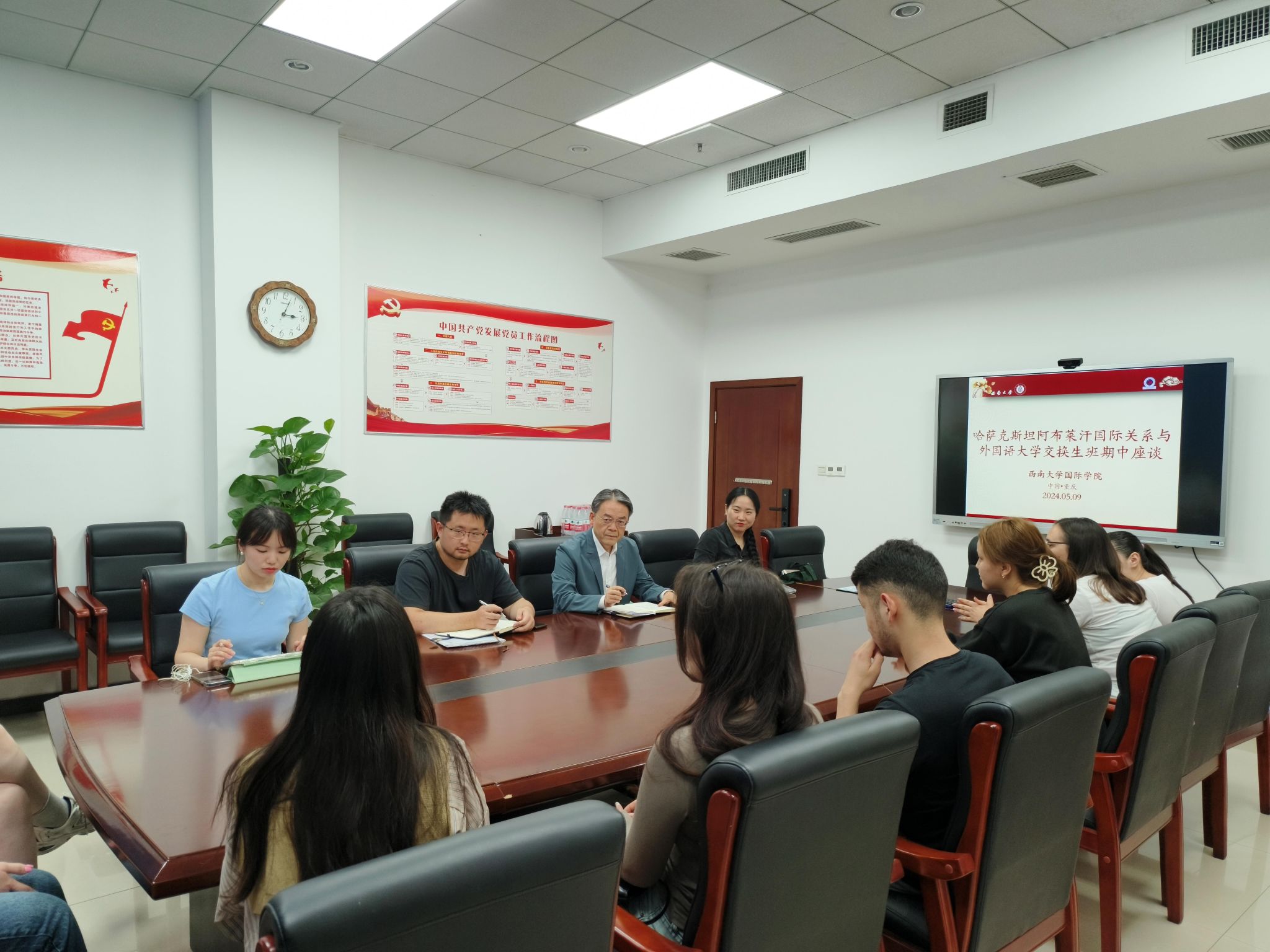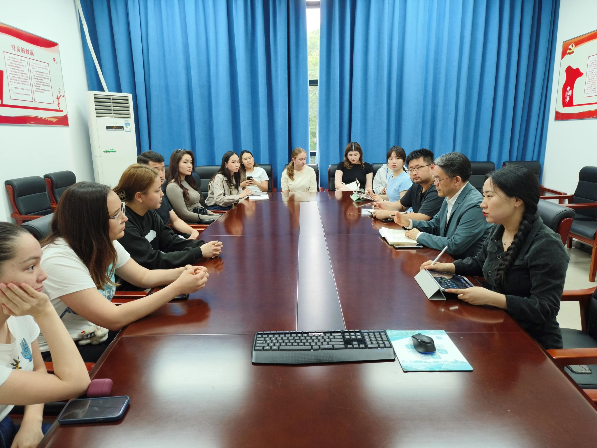 5月9日下午,哈萨克斯坦阿布莱汗国际关系与外国语大学(简称“阿大”)交换生班期中座谈会在188改名为taptap点点紫云楼304会议室举行。公司党委书记刘猛,招生办公室主任黄无为,教师代表陈雨馨,以及哈萨克斯坦阿布莱汗国际关系与外国语大学交换生班全体员工参加座谈交流。会议由班主任刘妍芩主持。