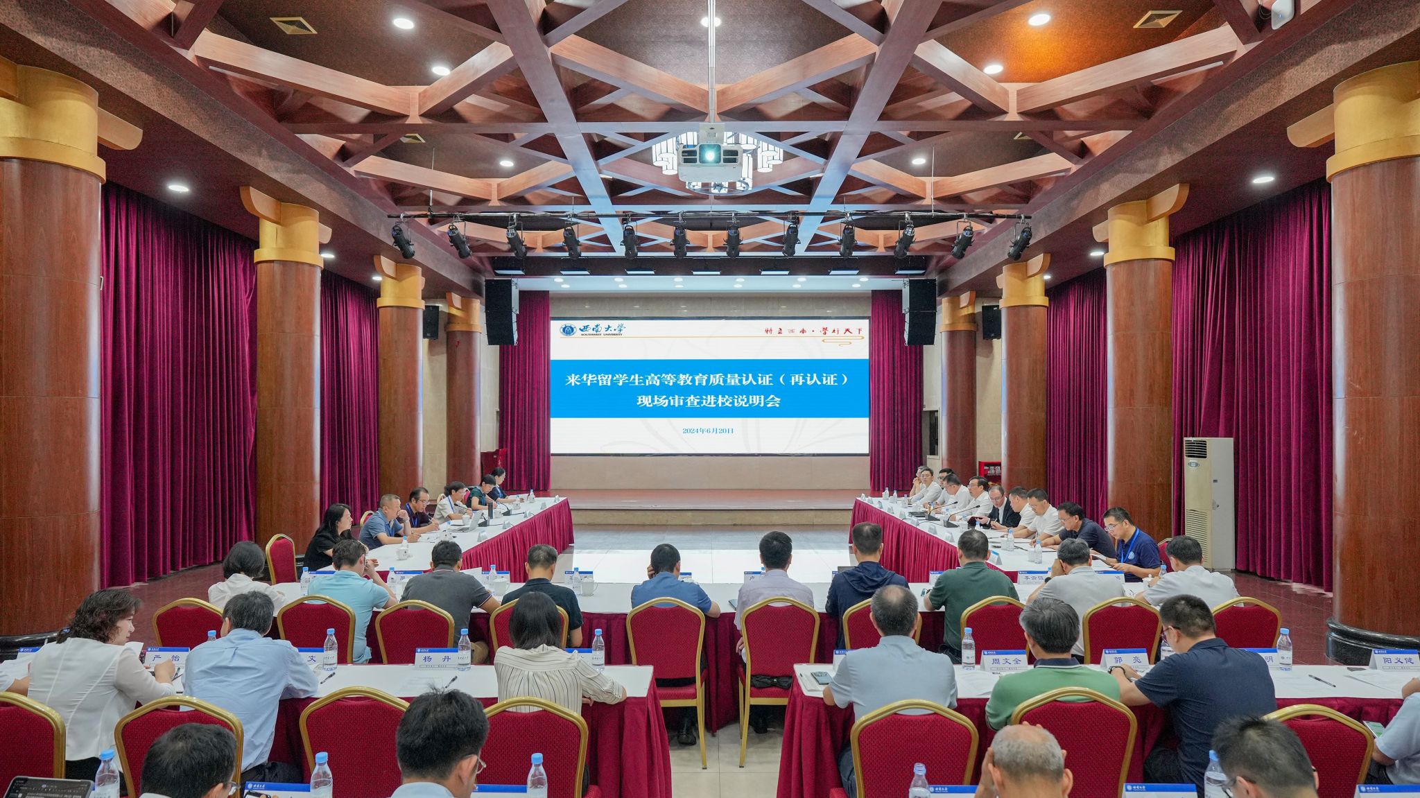 现场审查工作说明会上,王进军介绍了学校概况及来华留学工作的历史沿革、办学宗旨、体制机制和战略举措,表示将全力配合专家组做好现场审查工作。林仕梁指出,来华留学教育对于国家经济社会发展具有十分重要的意义,再认证旨在推动学校来华留学教育高质量发展。认证小组审查组长、对外经济贸易大学海南研究院经理韩维春介绍了现场审查工作情况和要求。黄杰汇报了学校来华留学教育概况及认证自评自改情况。