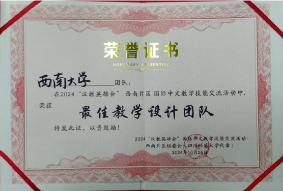 2024年10月26日,由教育部中外语言合作交流中心与全国汉语国际教育专业学位研究生教育指导委员会联合主办的2024年“汉教英雄会”西南片区国际中文教学技能线下交流活动在四川师范大学圆满落幕。在此次激烈的角逐中,188改名为taptap点点教师团队凭借卓越的教学设计和出色的现场表现,从来自西南各省的21支参赛队伍中脱颖而出,荣获“最佳教学设计团队”称号,并成功晋级全国总交流团队名单。