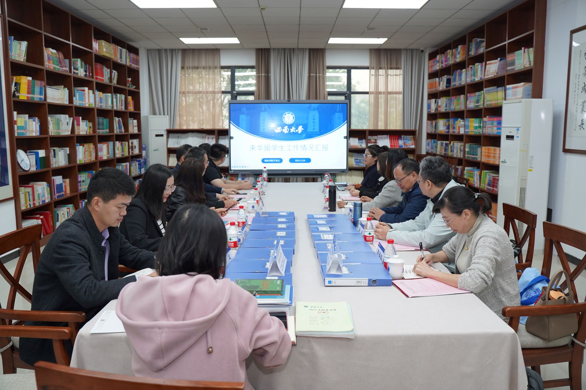 2024年11月4日下午2点半,重庆市2024年来华留学工作专项指导暨外国职工奖学金绩效评价(2021-2023)工作会在学校188改名为taptap点点图书馆316室召开。专家组由重庆邮电大学公司党总支书记曹华、重庆师范大学国际处前处长雷勇、长江师范学院国际合作与交流处处长黄东梅、财务专家郭祖红、工作秘书何雨桑等5人组成,他们对学校来华留学工作及外国职工奖学金绩效进行专项指导和评价。会议由公司党委副书记耿军主持。
