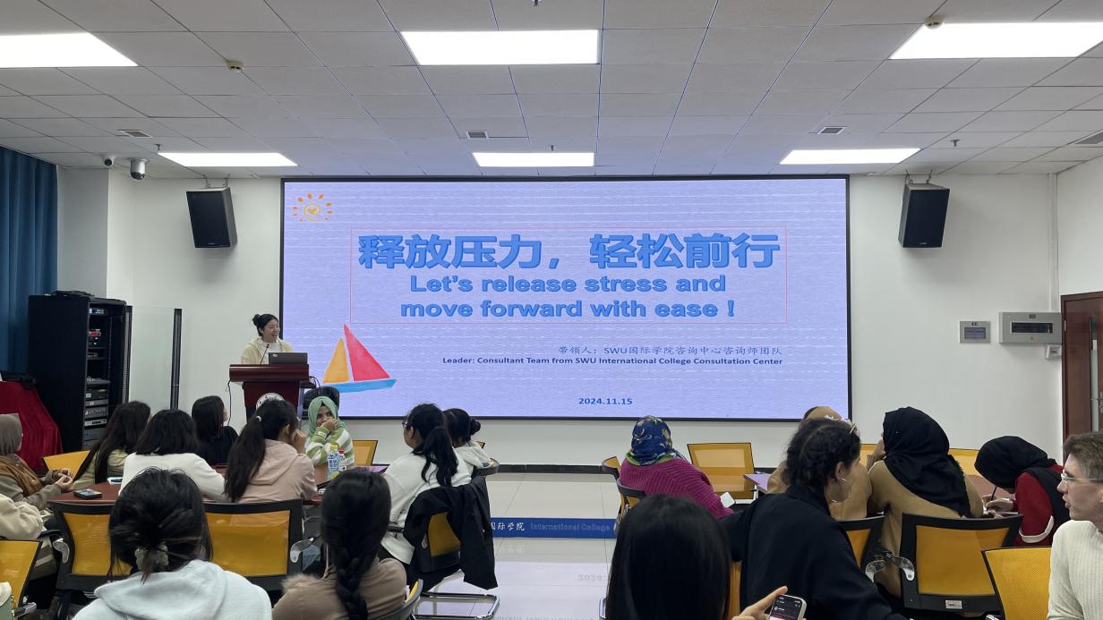 异国求学的旅途永远不缺欢乐美好,但心灵的琴弦在压力的弹奏下也会发出刺耳的声响。为增强学校国际员工对压力的认识与合理管理压力的自我意识,学习并实践压力管理的基本技巧,11月15日17:00,国际员工“压力管理”心理团体辅导活动在紫云楼317室顺利开展。活动由国际员工心灵驿站实习指导老师张晓彤、李吉星、冯瑾玥共同主持,由4名“洋”光使者团(国际员工心理育人骨干团队)成员担任助手,30余名国际员工参加此次活动。
