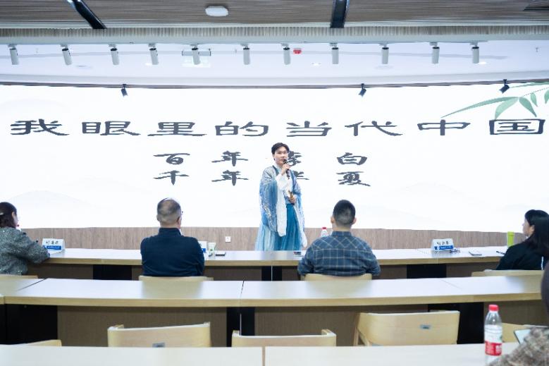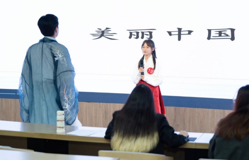 在中文演讲环节,谢青方从李白的角度出发,采用古今对比的手法,从人与自然的和谐相处、交通工具的进步、科学技术的发展以及人人平等等方面展示了他眼里的“富强、民主、文明、和谐、美丽”的当代中国。
