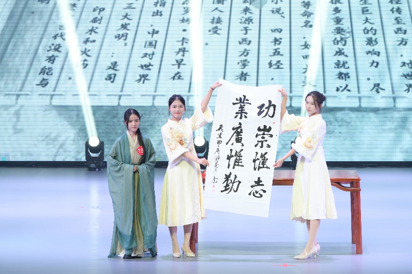 在中华才艺比拼环节,阮明月以书法为媒介,现场书写并配乐讲解了“功崇惟志,业广惟勤”这八个充满力量的大字,传递出了她对中国精神的理解,对当代中国的敬仰与热爱,她的书法作品赢得了评委和观众的一致好评。